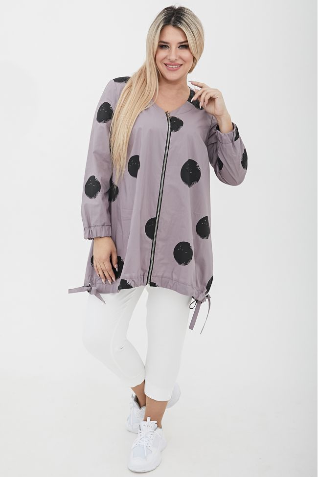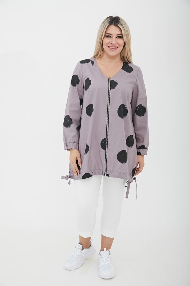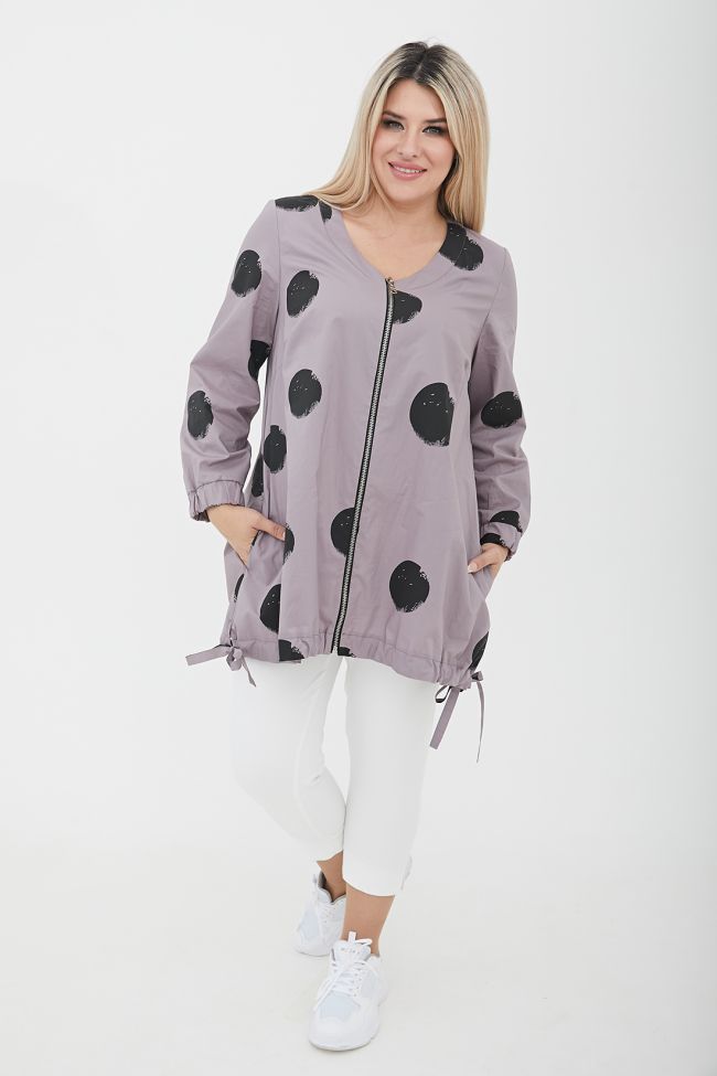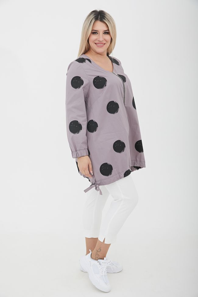 серый Свободная туника трапециевидного силуэта из поплина в принт "круги".  V - образный вырез горловины оформлен широкой обтачкой. По переду - центральная застежка на тесьму - молнию. Длинные втачные рукава, дополнены широкой манжетой на резинке. Модель с асимметричным низом - подчеркнутым притачной кулиской, по бокам разрезы с завязками. В боковых швах удобные карманы.