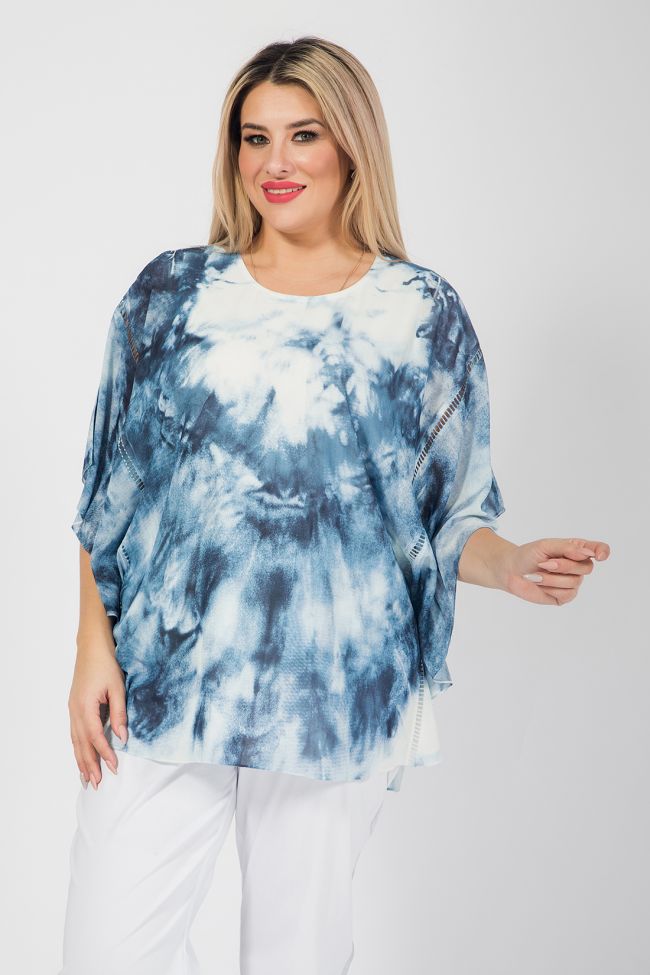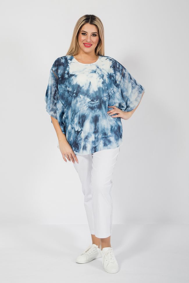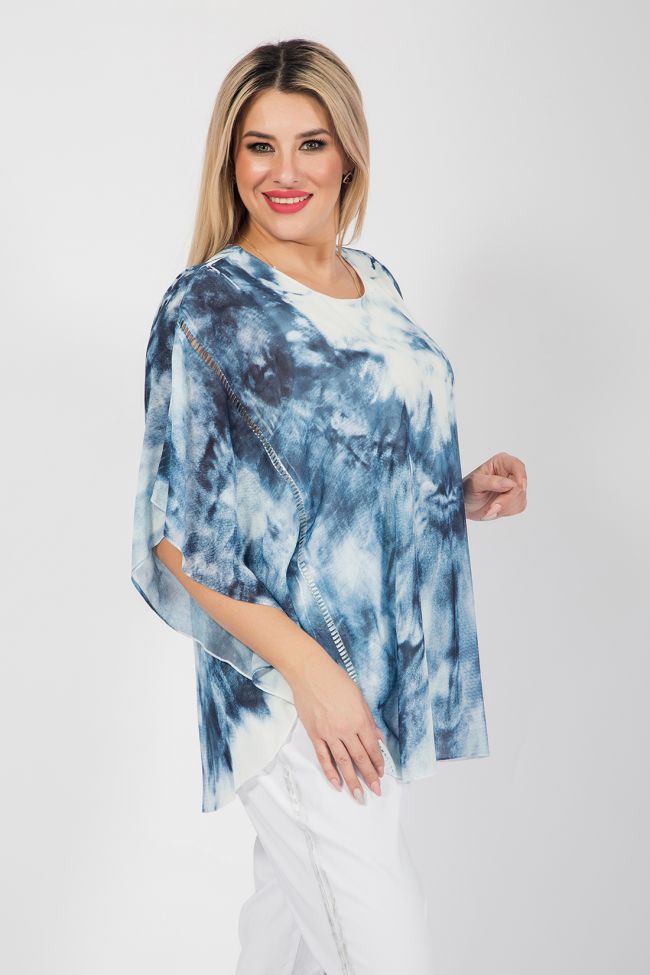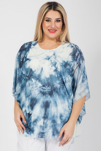 синий Женственная туника, кроя-пончо из шифона на трикотажном подкладе. Круглый вырез горловины обработан внутренним швом. Спущенное  плечо до линии локтя, нижний слой без рукавов. В виде отделки по переду вставки из декоративной тесьмы. Низ с актуальным закруглением, обработан ролевым швом. Уникальностью модели является нанесение принта на готовое изделие, что позволяет добиться интересного эффекта.