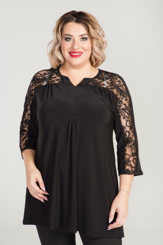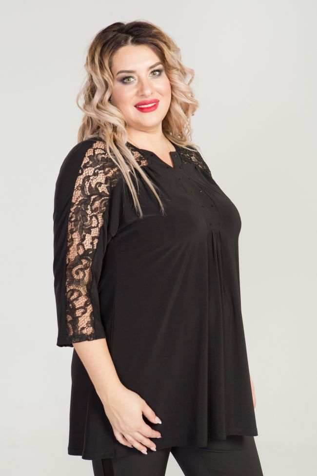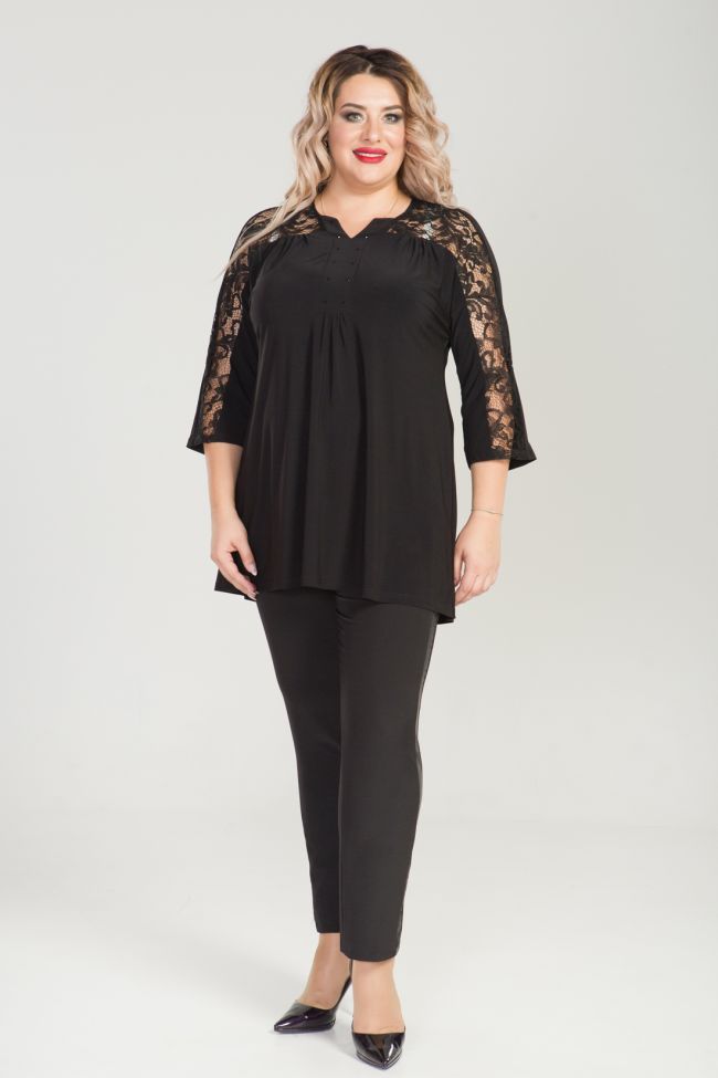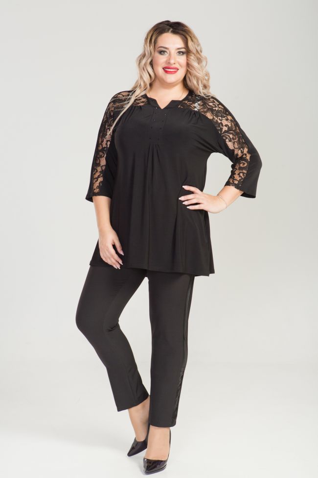 черный Очаровательная туника свободного кроя из пластичного трикотажного полотна длиной за линию бедер. Линия плеча оформлена изящным кружевом. Полочка, украшенная стразами, придает тунике нарядный вид. Хорошо гармонирует как с классической юбкой, так и с зауженными брюками.