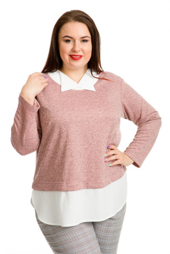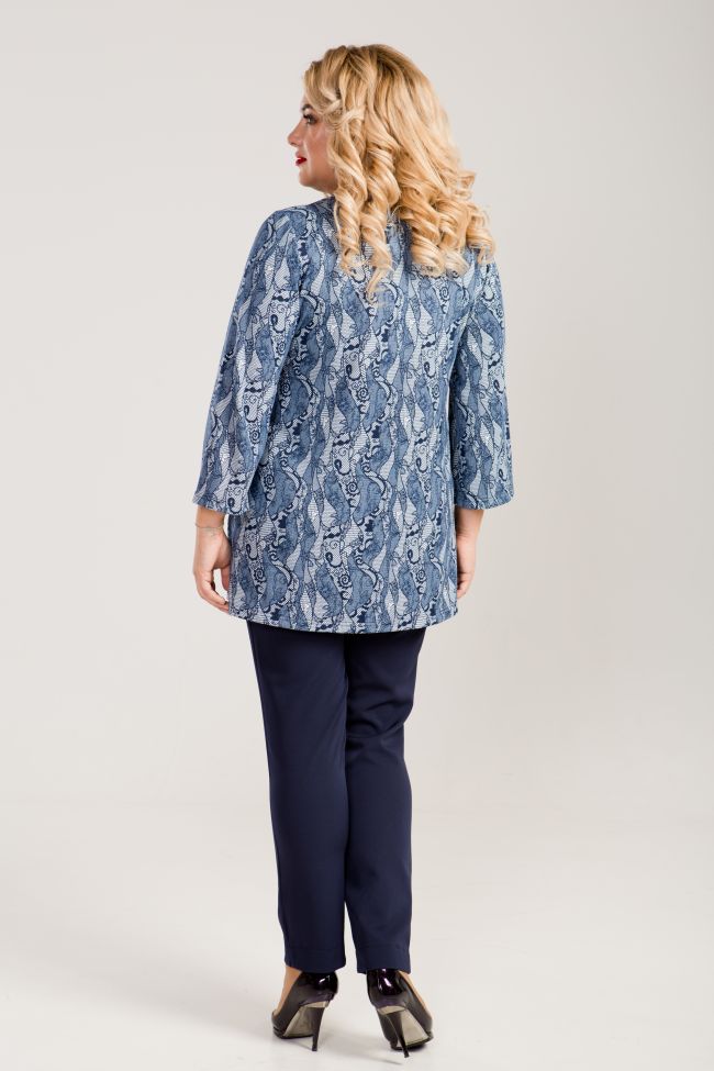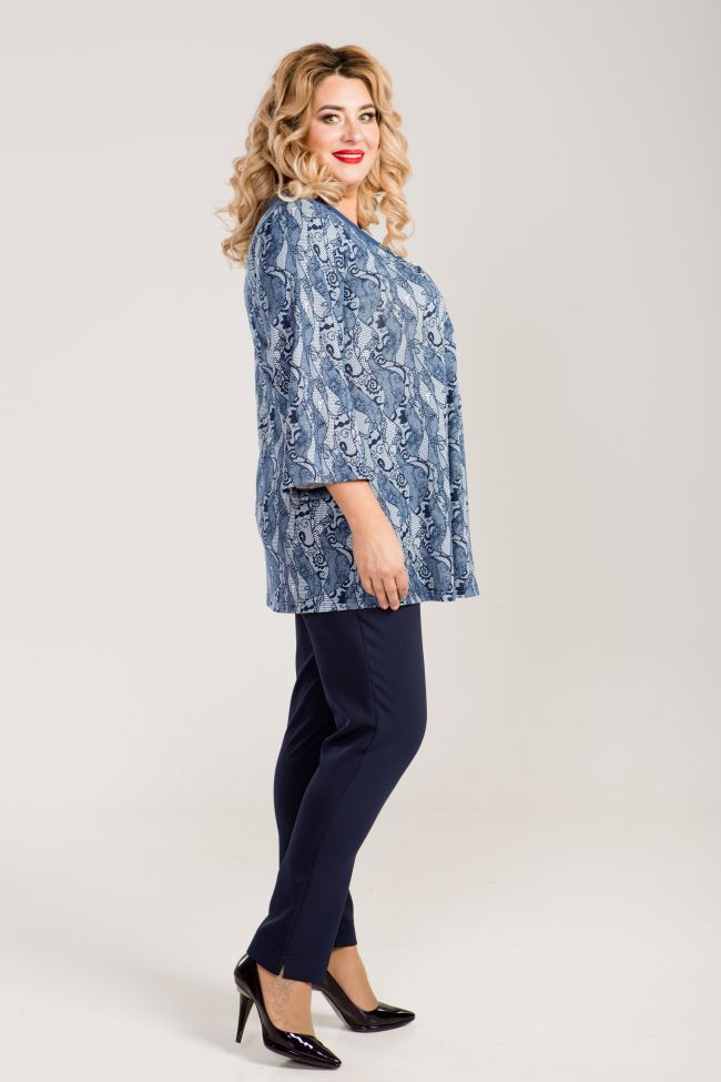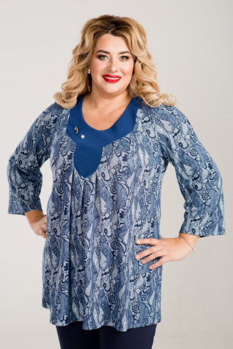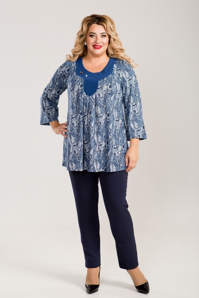 синий Туника трапециевидного силуэта из трикотажного полотна. Фигурная кокетка переда выполнена из контрастного отделочного материала. По переду защипы от кокетки. Втачные рукава длиной 3/4 согреют в прохладную погоду.  Прекрасное решение на каждый день. В качестве украшения -  оригинальная брошь.