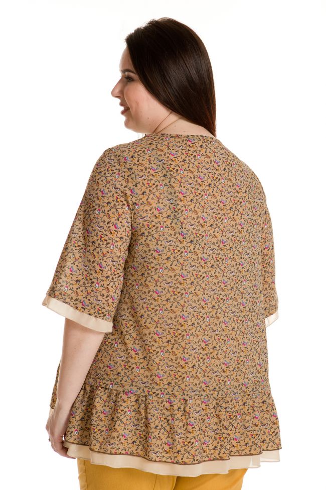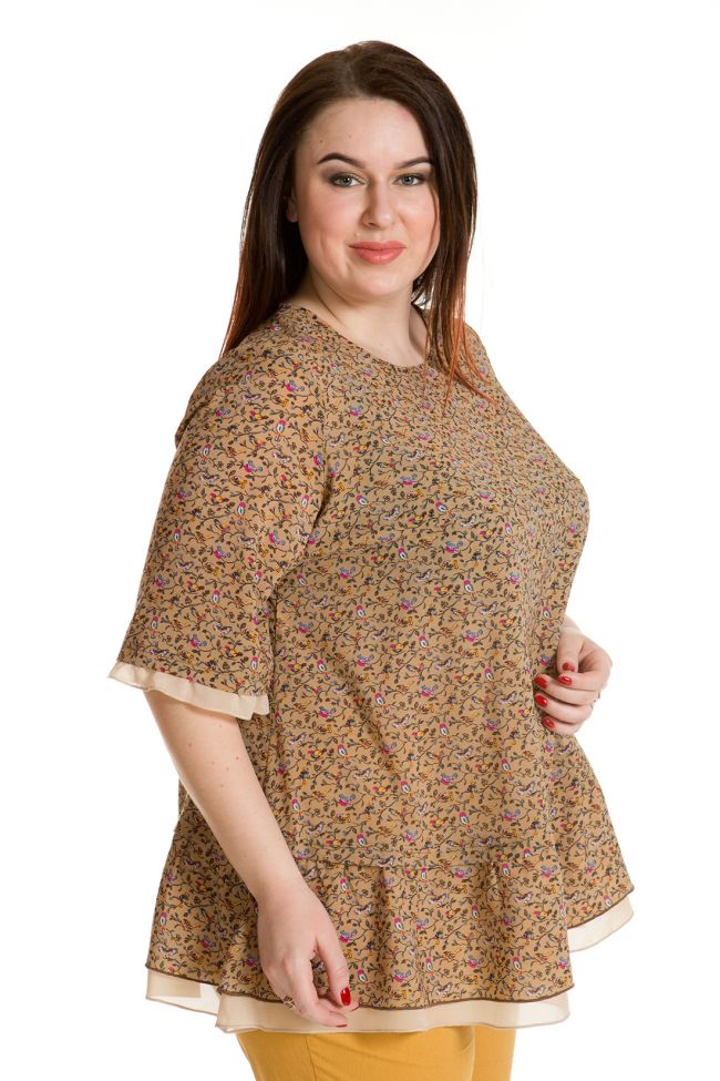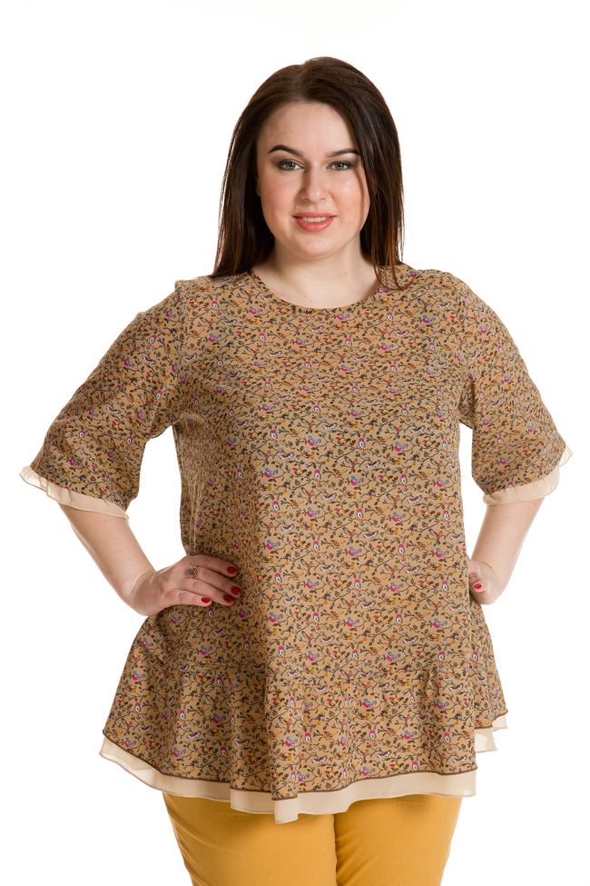 коричневый Туника трапециевидного силуэта из мягкого шифона с оригинальным принтом. Втачные рукава ¾ с воланом по низу. Круглый вырез горловины обработан окантовкой. Блузка отрезная по линии бедер, притачная деталь со сборкой образует романтичный волан. Модель прекрасно гармонирует с юбками или брюками. Замечательный выбор для создания женственного повседневного образа.