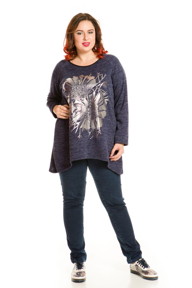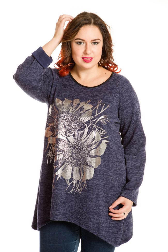 синий Туника трапециевидного силуэта из натурального трикотажного полотна. Данная ткань приятна к телу и согреет в прохладную погоду. Круглая горловина обработана окантовкой. Длинные рукава покроя реглан-погон. Низок переда и спинки асимметричный, удлинен по боковым швам. По переду выполнена печать цветочный принт. Прекрасное решение на каждый день.