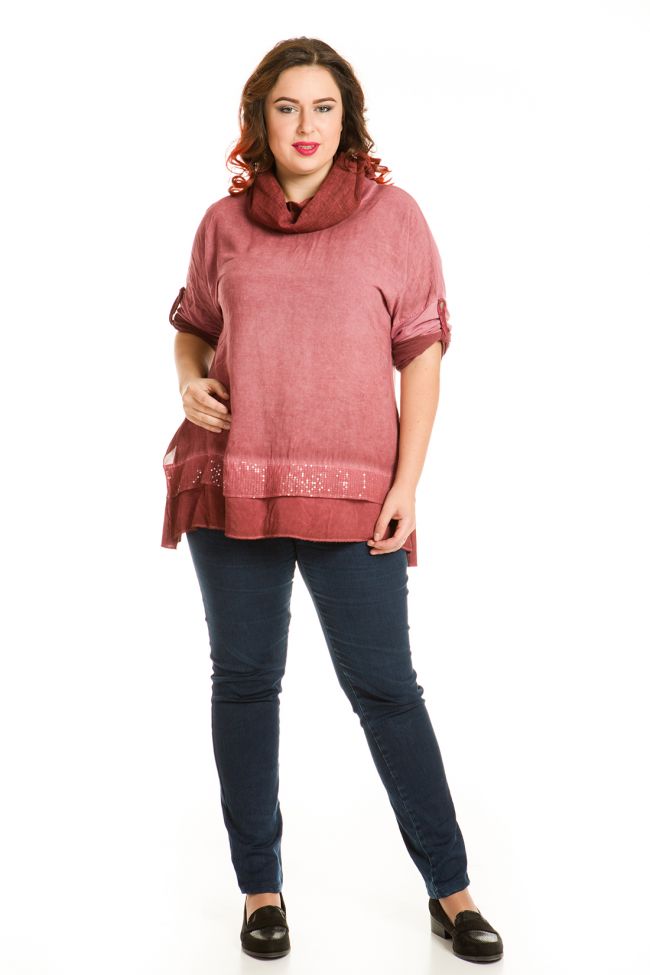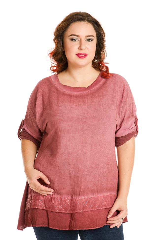 красный Комфортная туника трапециевидного силуэта с высокими разрезами по боковым швам. Круглая горловина обработана внешней обтачкой. Длинные рубашечные рукава на спущенной пройме собраны на паты. Рукава и спинка из трикотажного полотна. По низу переда эффектная вставка пайетками. Оригинальная длина не сковывает движения. Перед туники из штапеля, имеет оригинальный окрас за счет специального способа окраски stone wash. За счет этого ткань становится мягче и приятнее на ощупь. Прекрасный вариант для прогулок и отдыха.