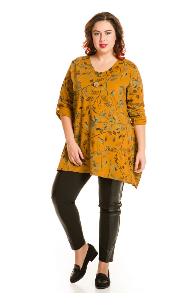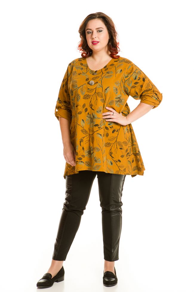 оранжевый Удобная туника трапециевидного силуэта из хлопкового трикотажного полотна. Круглый вырез горловины обработан обтачкой и дополнен элементами декора - пуговицами. Втачные рукава собраны на декоративные паты с пуговицами. Цветочный принт придаст образу утонченности. За счет оригинального кроя достигнут эффект ассиметричного низа с боковыми разрезами. Туника прекрасно гармонирует с брюками. Отличный выбор на каждый день.