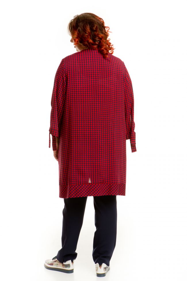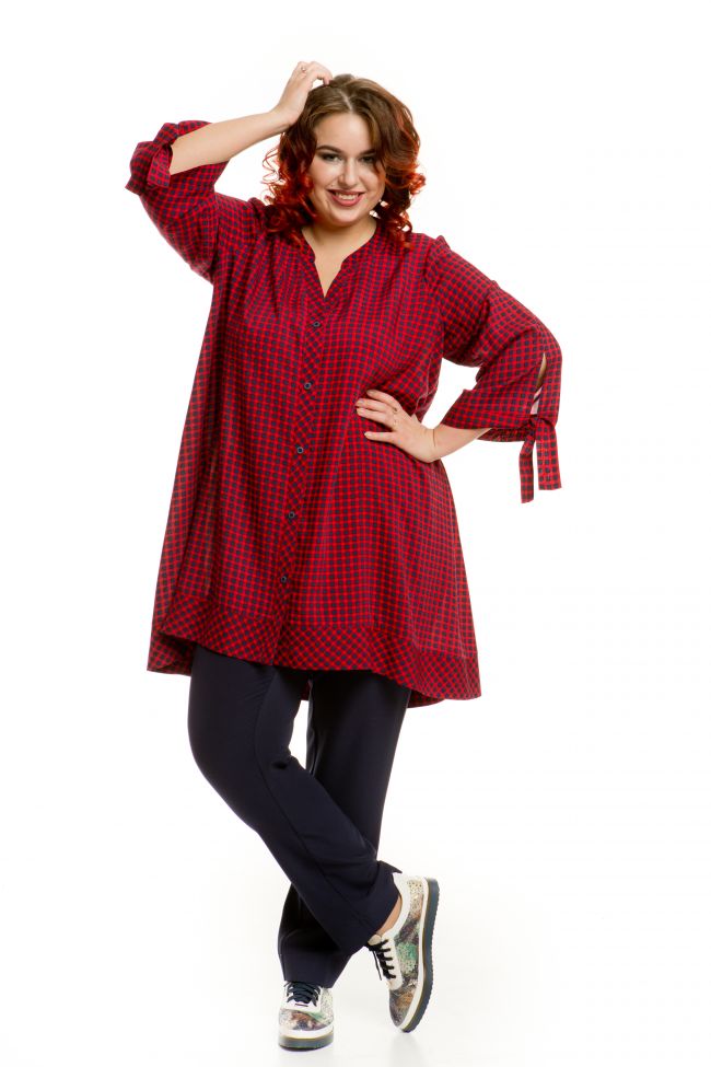 красный Свободная удлиненная рубашка трапециевидного силуэта из легкой хлопчатобумажной ткани. Вырез горловины оформлен воротником-стойкой и соблазнительным V-образным вырезом. Застежка центральная на петли и пуговицы. Укороченные втачные рукава длиной 3/4 оформлены снизу манжетами, переходящими в завязки. Модель с асимметричным низом - по переду короче - подчеркнутым притачной обтачкой. Рубашка добавит сочных красок в Ваш повседневный гардероб и отлично дополнит джинсы или брюки.