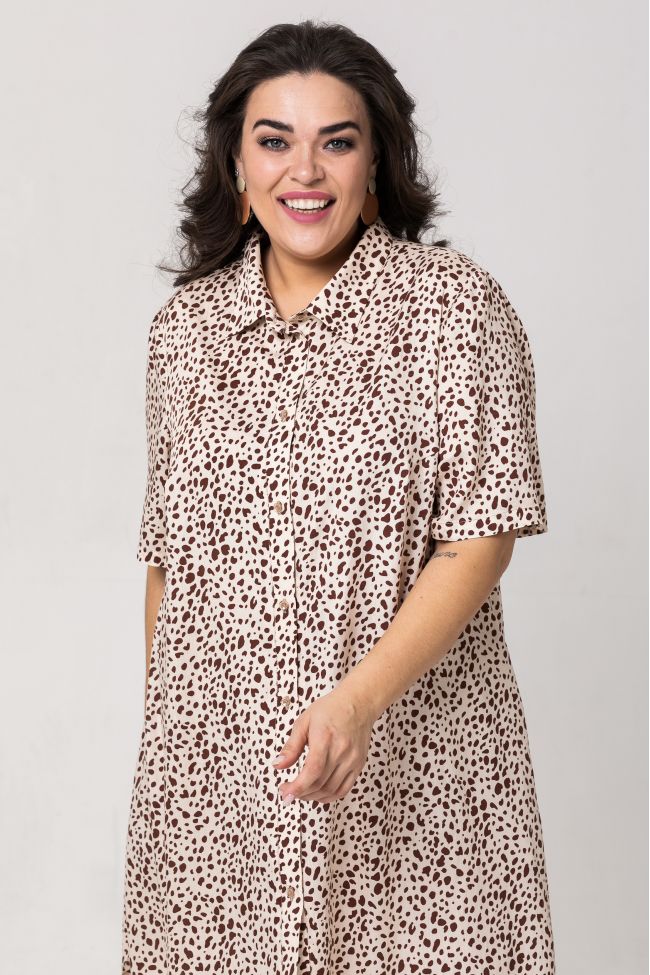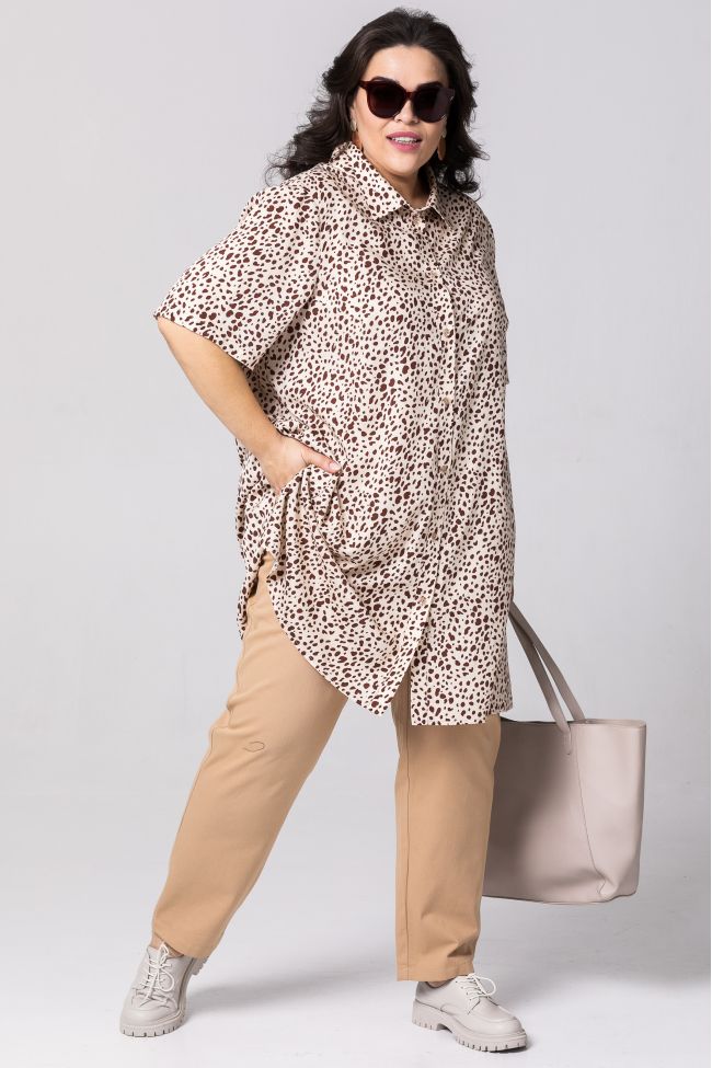 бежевый Туника А-образного силуэта из хлопчатобумажной ткани в принт. По переду - центральная застежка с планкой на петли и пуговицы, горловина дополнена рубашечным воротником на стойке. Прилегание по груди за счет вытачек. Укороченные втачные рукава. Туника отлично дополнит летний гардероб в комплекте с узкими джинсами или брюками.