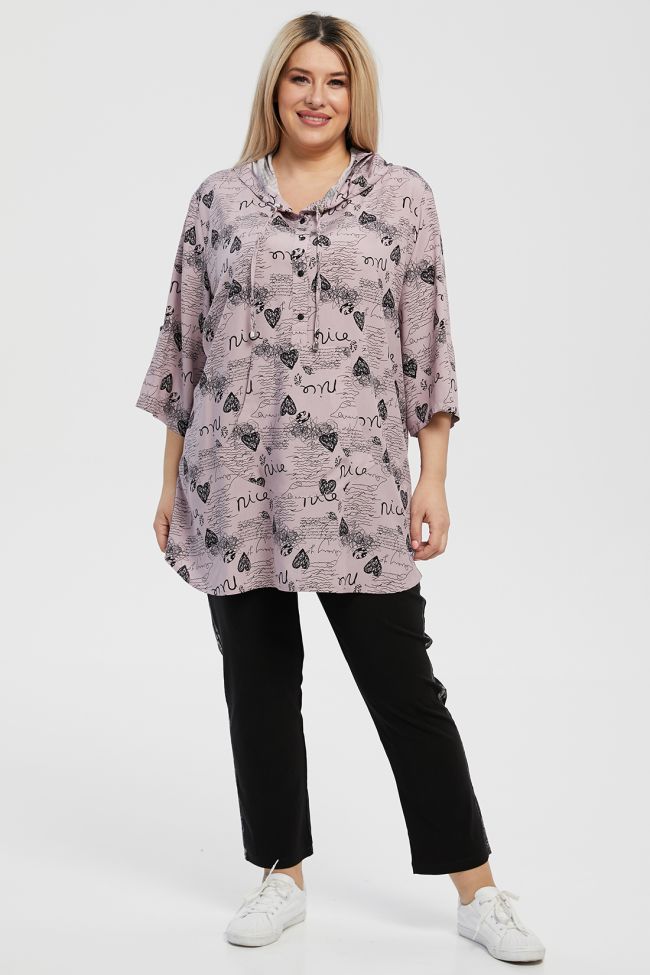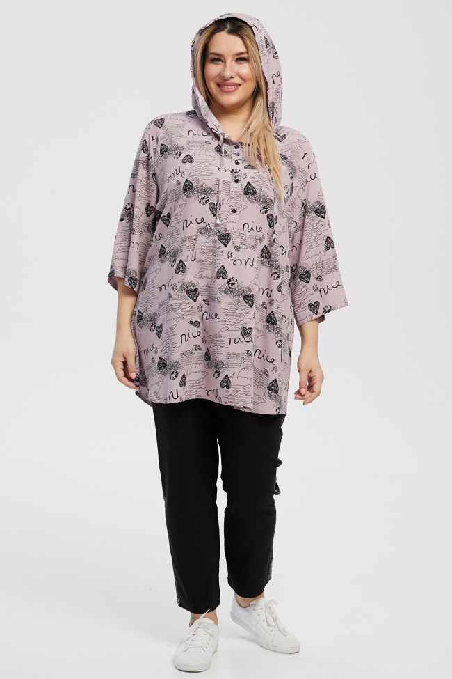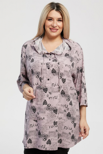 розовый Свободная туника из штапельной ткани с актуальным принтом. Круглый вырез горловины дополнен капюшоном с завязками. По центру переда застежка на петли и пуговицы до линии талии и накладной карман "кенгуру". Втачной рукав на спущенной линии плеча длиной 3/4.  Рукава и боковые швы присобраны на пату.