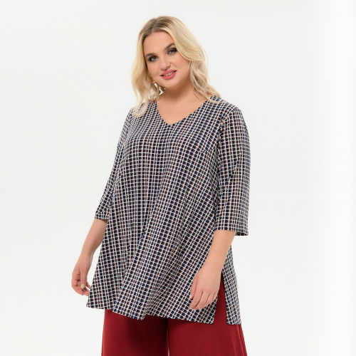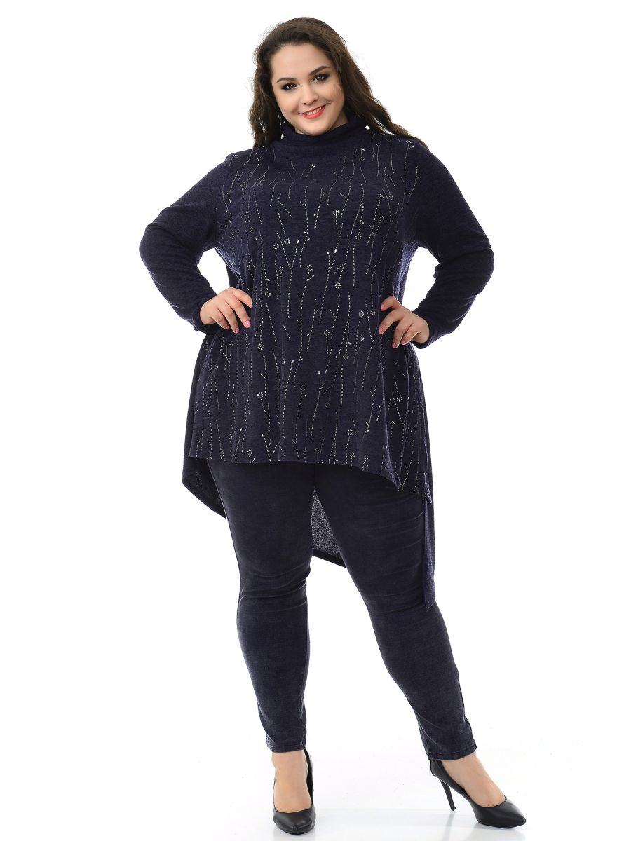 По горловине небольшой воротник-"хомут". В боковых швах разрезы. Линия низа асимметричная. Рукав длинный. Туника отлично сочетается с узкими брюками или легинсами.