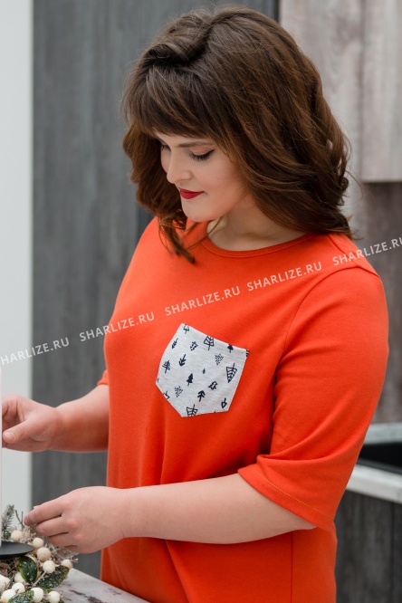 Эффектная туника насыщенного красно-оранжевого оттенка с аккуратным декоративным кармашком выглядит красиво, женственно и игриво. Подойдет в качестве повседневной одежды. Изготовлена из тонкого трикотажа, мягко облегающего фигуру. Современная ткань интерлок содержит натуральное волокно, славится своей шелковистостью, нежностью и прочностью.
