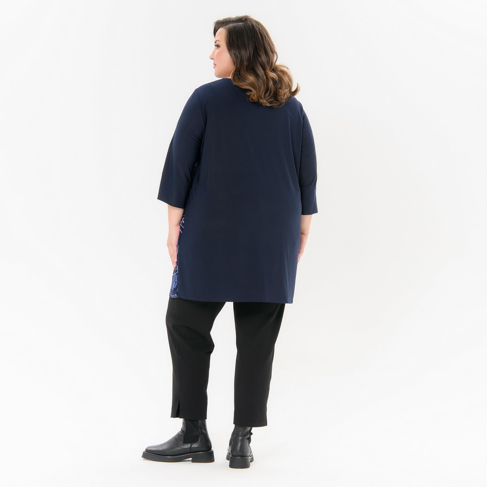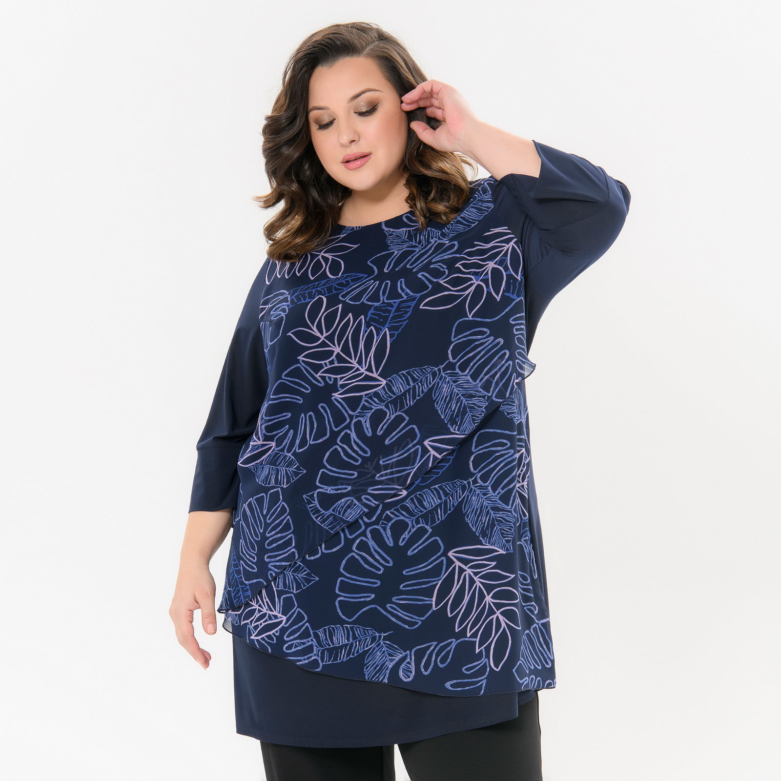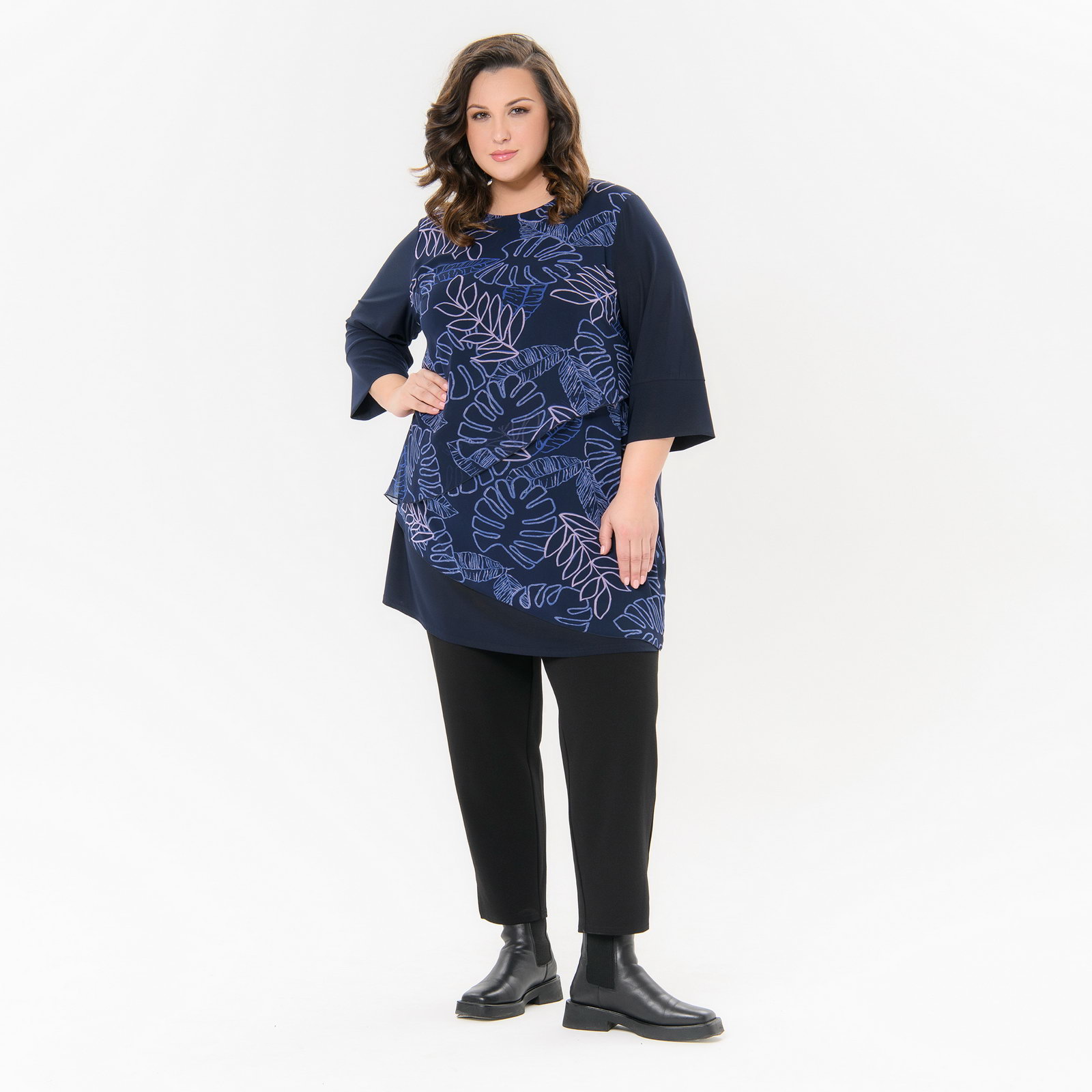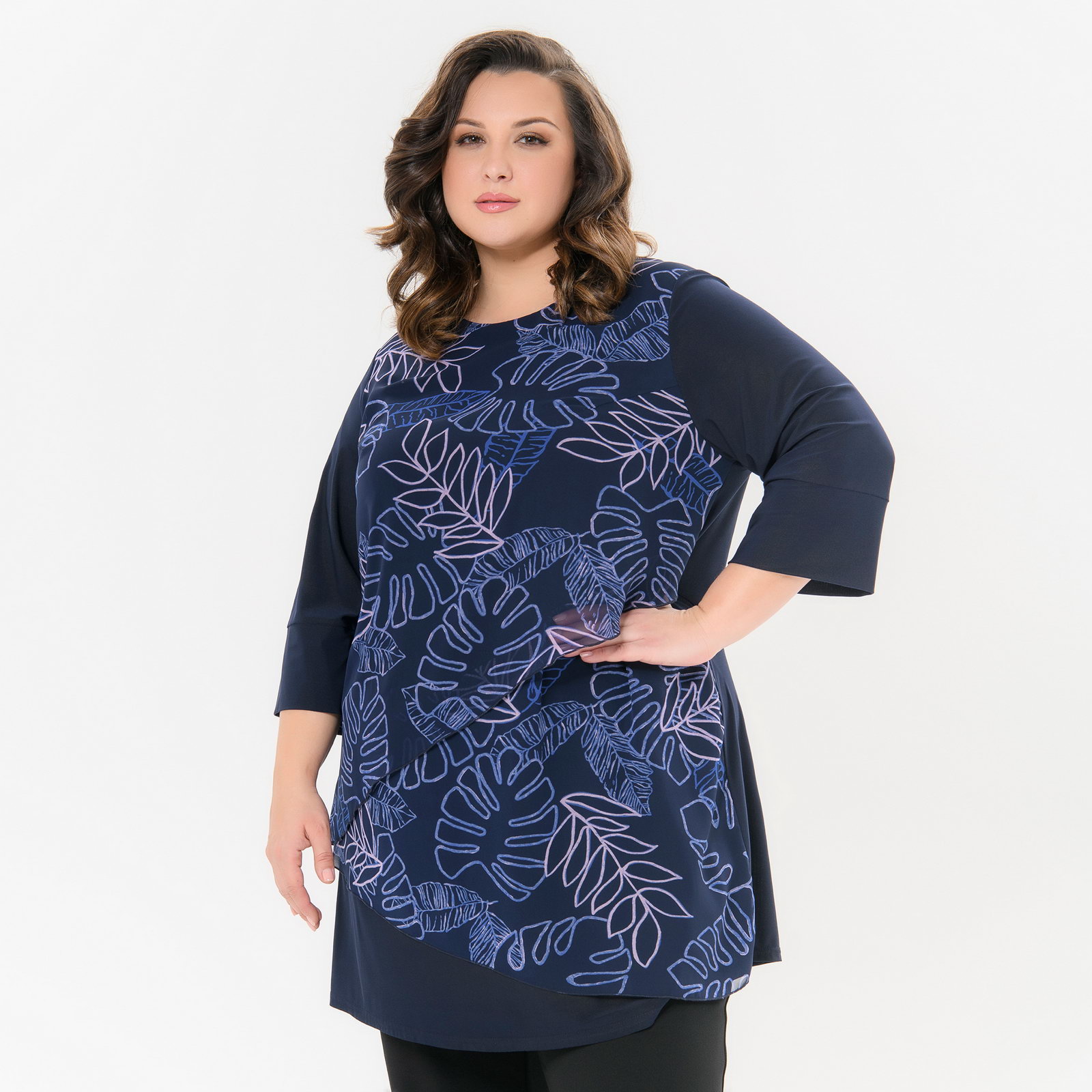 Туника комбинированная, шифон принт "роскошный"/трикотаж темно-синий
