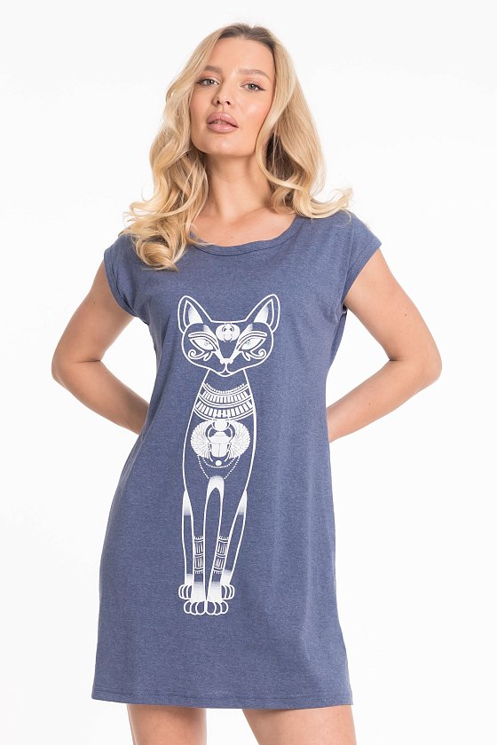Туника домашняя выполнена из однотонного хлопкового полотна. Покрой прямой, без рукавов, горловина имеет круглый вырез. Проймы и горловина обработаны бейкой. Спереди расположен принт.