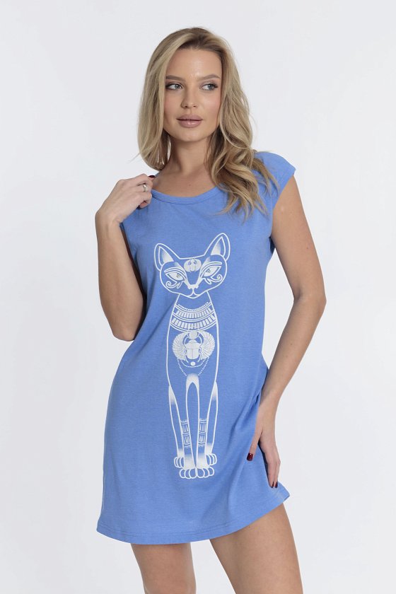Туника домашняя выполнена из однотонного хлопкового полотна. Покрой прямой, без рукавов, горловина имеет круглый вырез. Проймы и горловина обработаны бейкой. Спереди расположен принт.