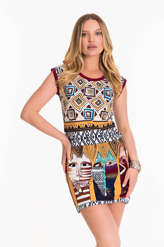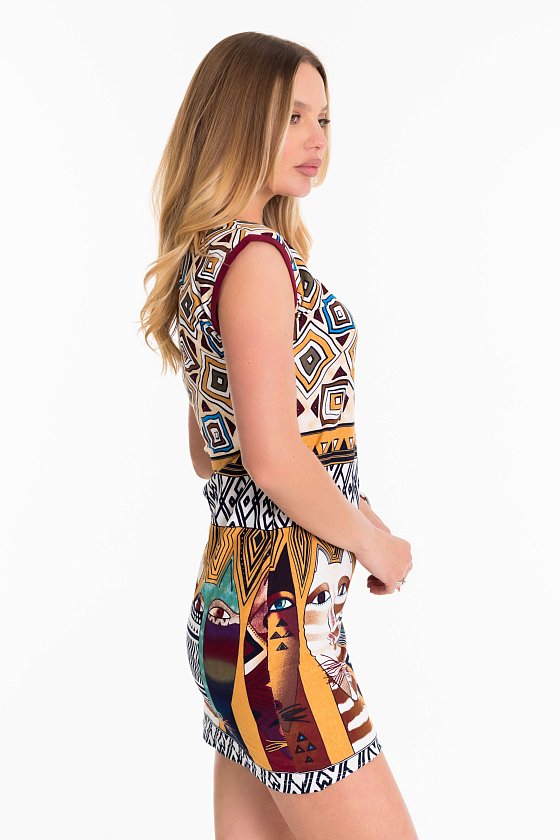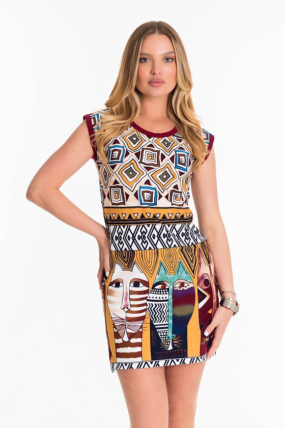 Туника домашняя выполнена из набивного хлопкового полотна. Покрой прямой, без рукавов, горловина имеет круглый вырез. Проймы и горловина обработаны бейкой.