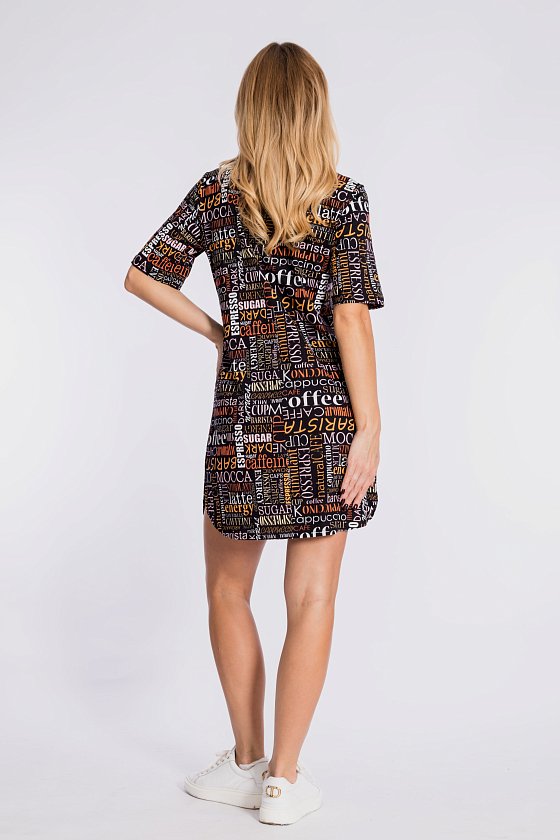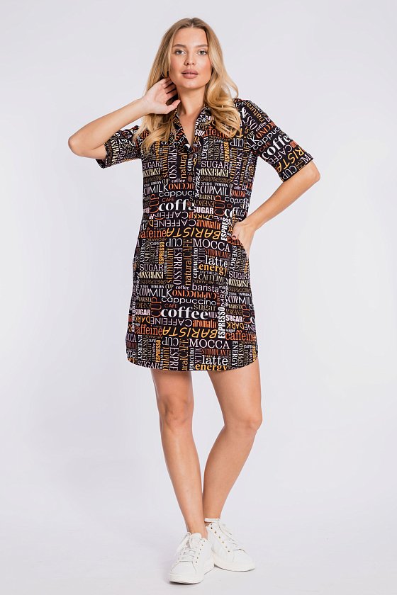 Туника выполнена из х/б полотна с набивным рисунком. Застёжка на пуговицы до пояса. Воротник отложной, рукава короткие, низ туники со скруглением к боковым швам. Спереди расположены карманы.
