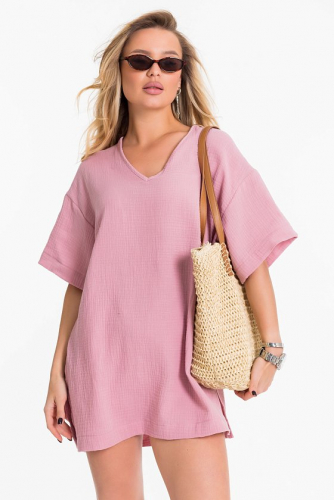 Туника выполнена из кулирки, 100% хлопок. Горловина круглая, на рукавах декоративные разрезы. Детали туники обработаны бейкой.