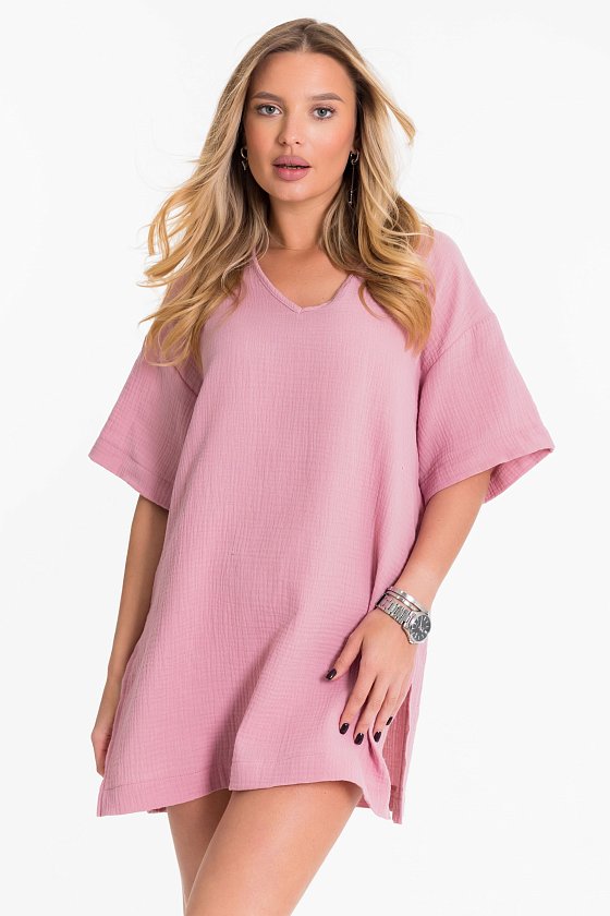 Туника из однотонного муслина. Свободного кроя, со спущенным коротким рукавом, V-образной горловиной. Туника длиной до середины бедра. В боковых швах разрезы.