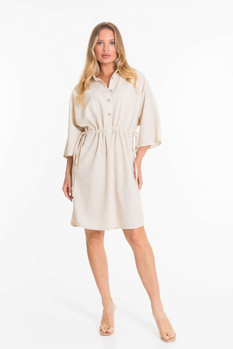 Туника выполнена из однотонного натурального льна с добавлением вискозы. По линии талии проходит кулиска со шнурами, которые завязываются сбоку. Лиф с воротником на отрезной стойке и с застежкой на пуговицы. Низ туники слегка скругленный, с декоративными боковыми разрезами.