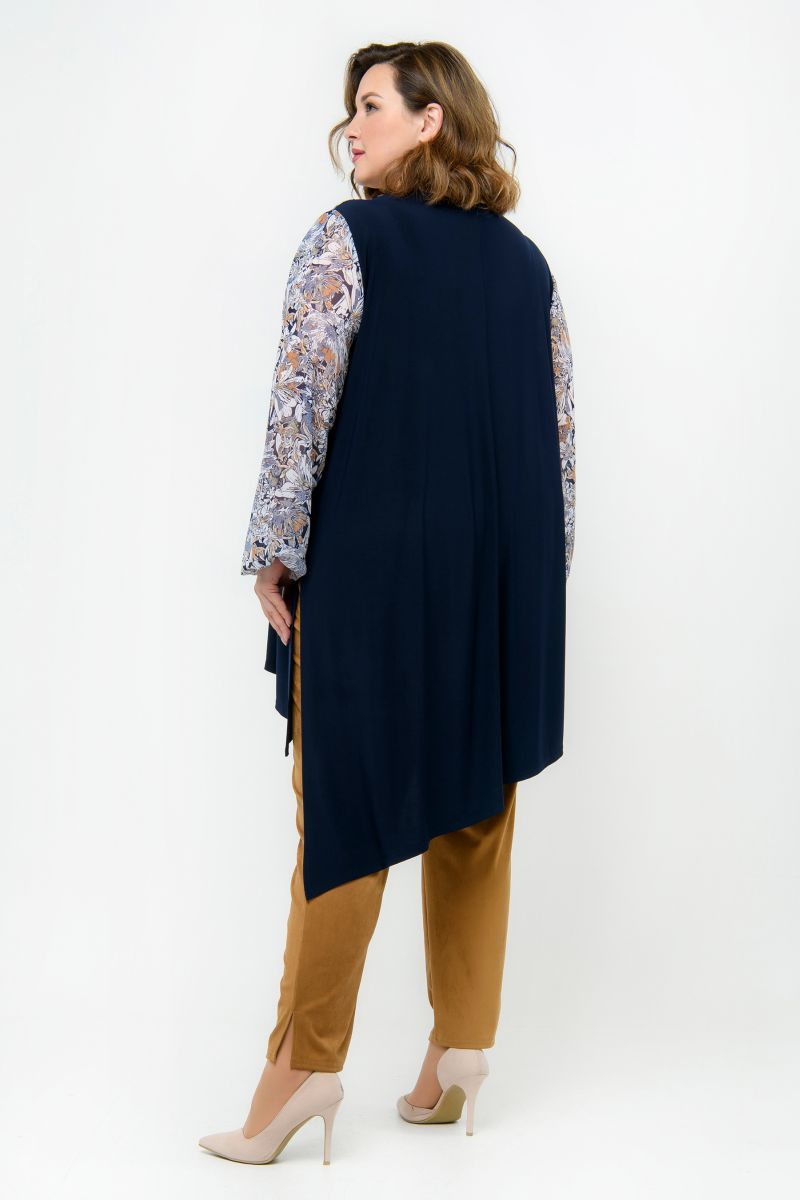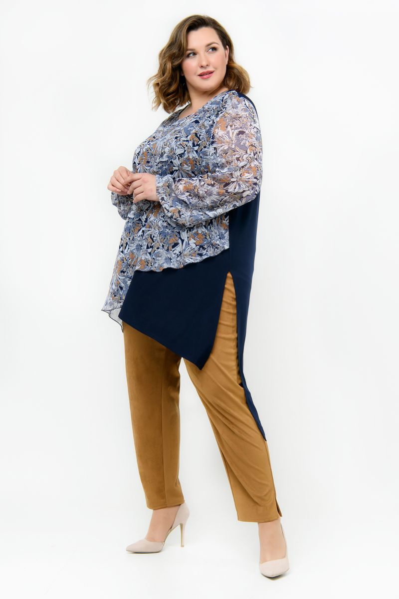 Стильная многоуровневая туника из легкого темно-синего трикотажа, комбинированного с принтованым шифоном . Внутренняя часть переда и спинка из трикотажа, верхняя часть переда и рукава из шифона. В боковых швах разрезы. Линия низа асимметричная. Рукав длинный, свободный, на резиночке по низу.  Грамотно проработанные разноуровневые вертикали правильно корректируют и зрительно вытягивают силуэт.