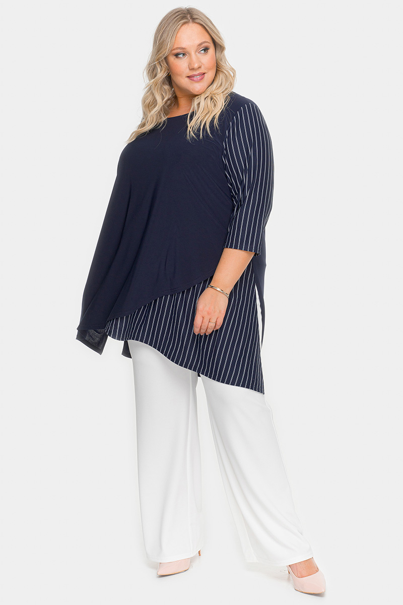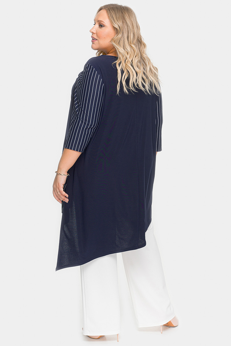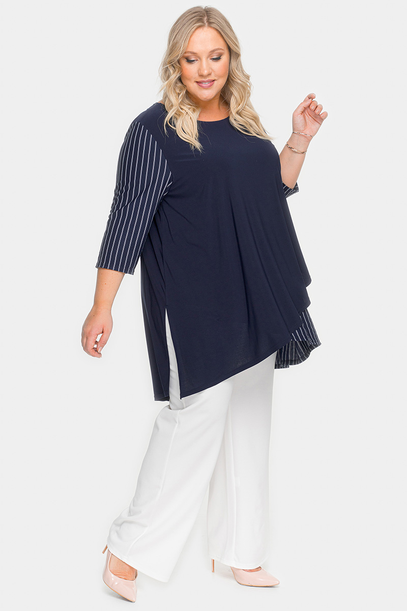 Стильная многоуровневая туника из легкого темно-синего трикотажа, комбинированного с полоской. Внешняя часть переда и спинка темно-синие, внутренняя часть переда и рукава из отделочной ткани в полоску. В боковых швах разрезы. Линия низа асимметричная, рукав 3/4.  Прекрасно сочетается с узкими брюками или легинсами.