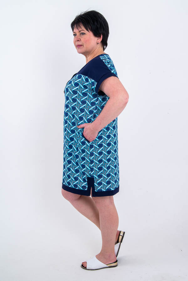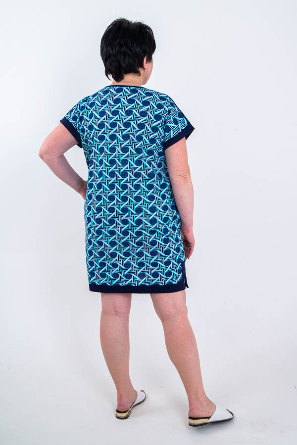 Туника женская полуприлегающего силуэта из трикотажного полотна «кулирка» длинной выше уровня колена. На полочке отрезная кокетка из комбинированного материала в цвет манжет, в боковых швах 2 кармана. Вырез горловины О-образный, спереди застежка планка на петли пуговицы. Низ туники обработан планкой с разрезами по боковым швам.