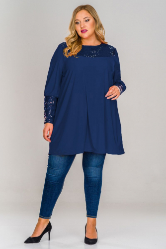 Нарядная туника свободного силуэта, кокетка и манжеты выполены из пайеток в цвет основной ткани.
