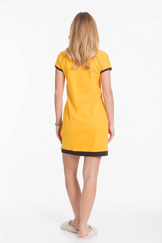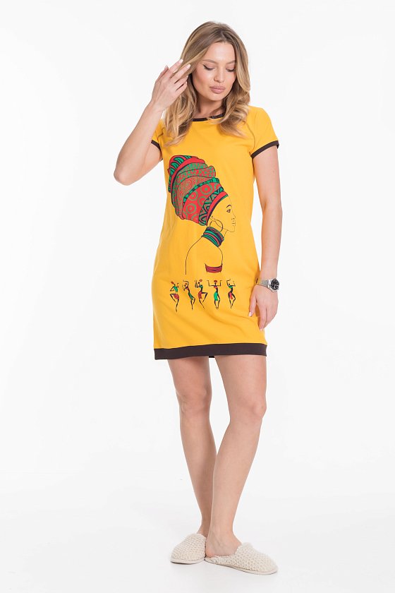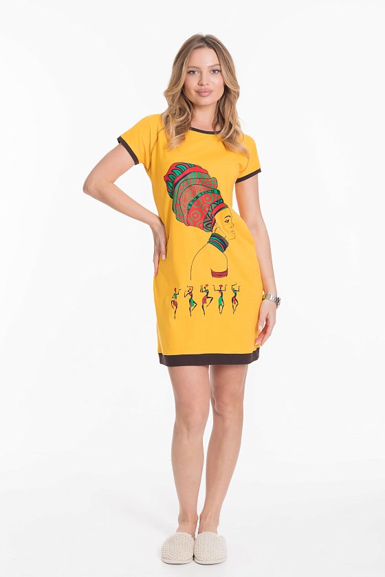 Туника женская выполнена их кулирного полотна. Вырез горловины круглый, рукав короткий, покроя реглан. Планки на рукавах, горловине и низу изделия из отделочного полотна контрастного цвета. Спереди расположен оригинальный принт.