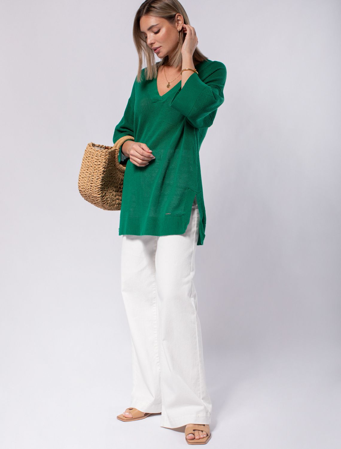 Туника полупрозрачной вязки выполнена из мягкой пряжи на основе хлопка с вискозой. Идеально подойдет в жару, защитит от палящего солнца и при этом не будет перегревать тело. Отлично сочетается с мини-топом или с купальником. В обычной жизни хорошо аккомпанирует с денимом и льном. Изделие дополнено металлическим логотипом бренда.