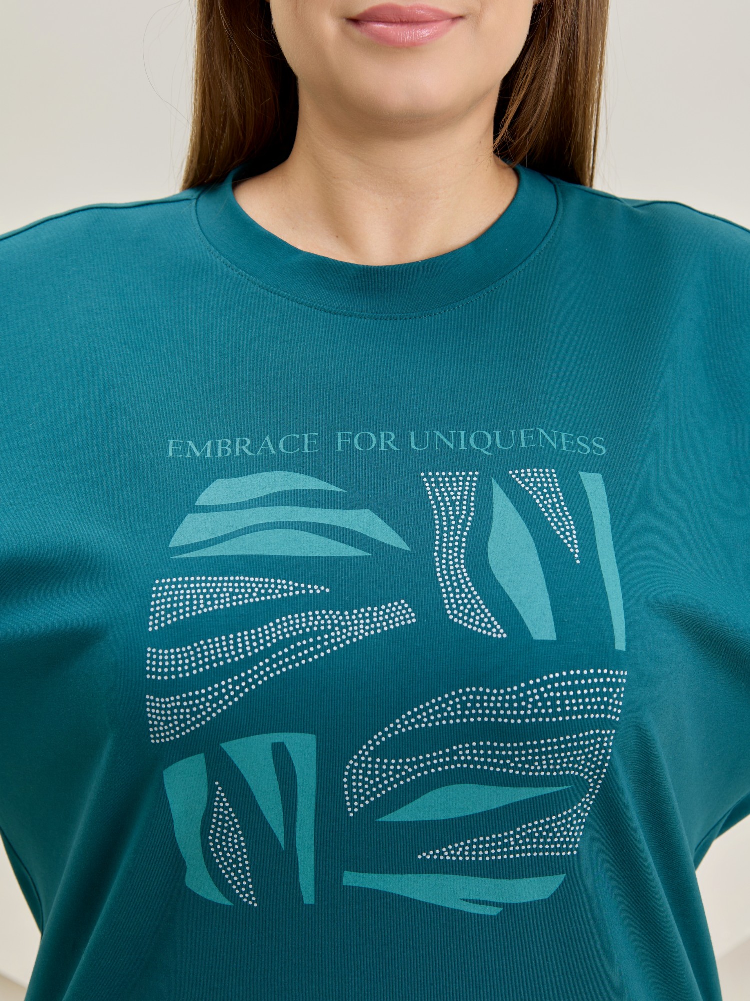 Туника женская из гладкокрашенного полотна «кулирка» с лайкрой, свободного покроя, с втачными рукавами длиной до локтя, горловиной овальной формы, обработанной втачной планкой и разрезами в боковых швах. На полочке принт, выполненный в технике «шелкографии».