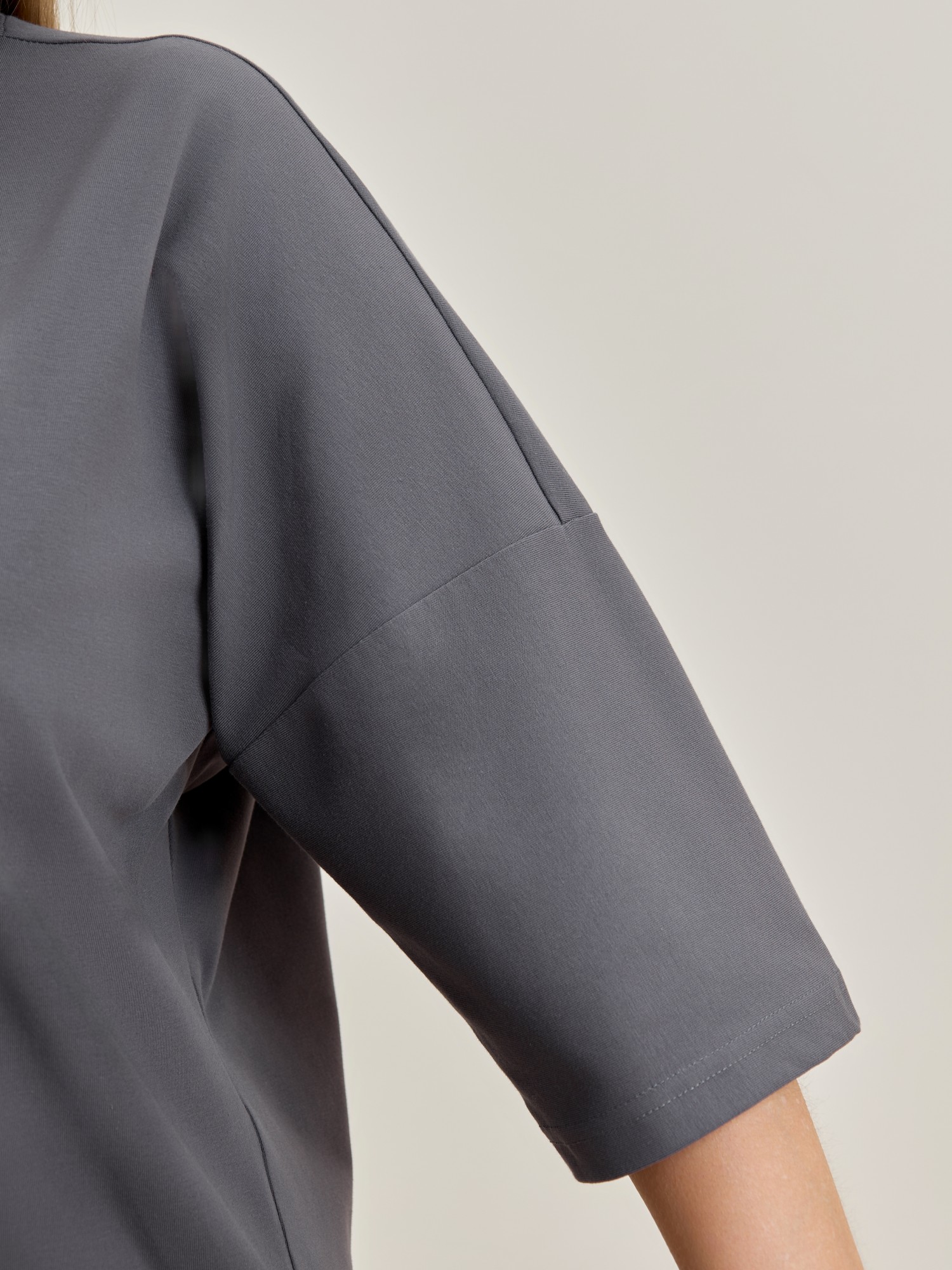 Туника женская из гладкокрашенного полотна «кулирка» с лайкрой, свободного покроя, с втачными рукавами длиной до локтя, горловиной овальной формы, обработанной втачной планкой и разрезами в боковых швах. На полочке принт, выполненный в технике «шелкографии».