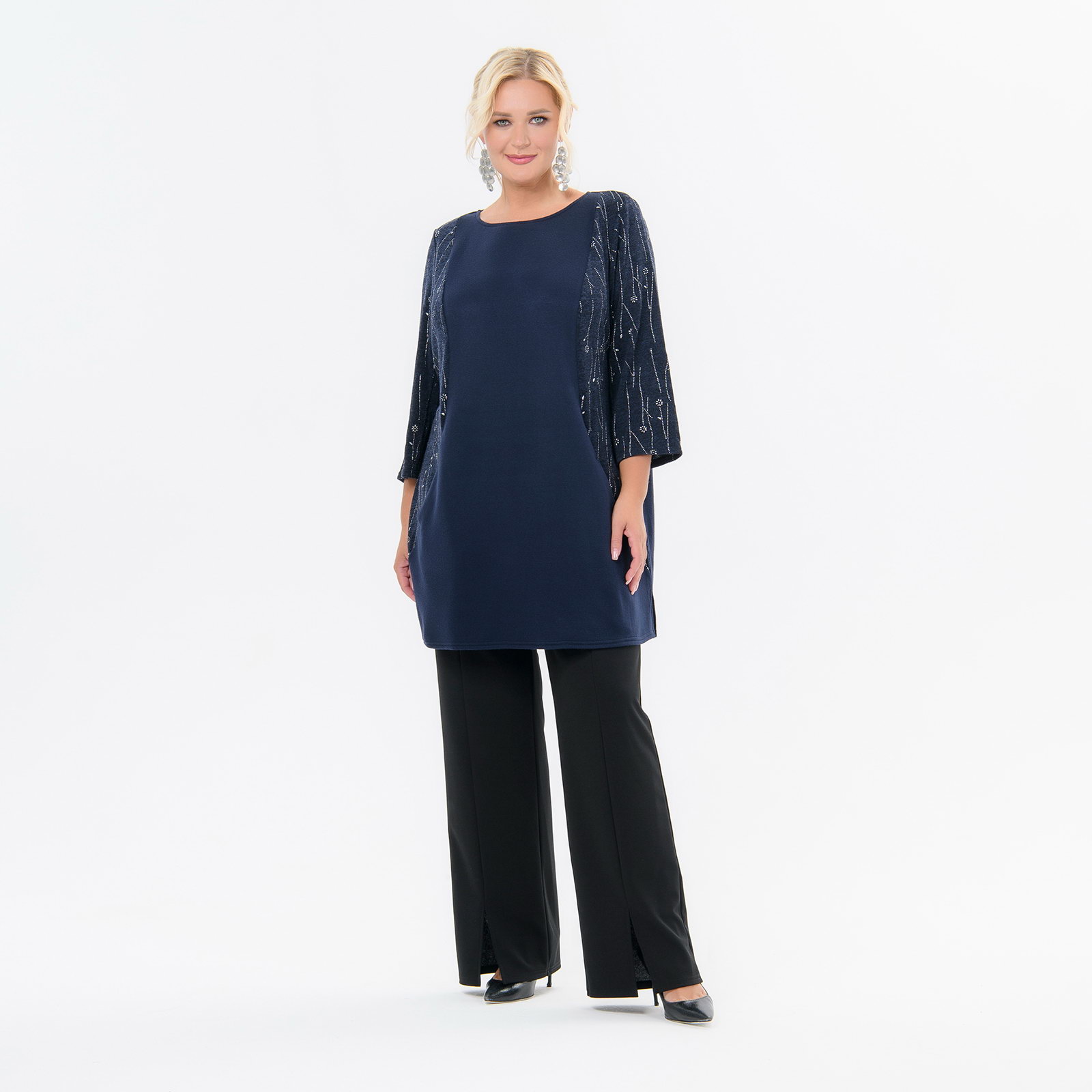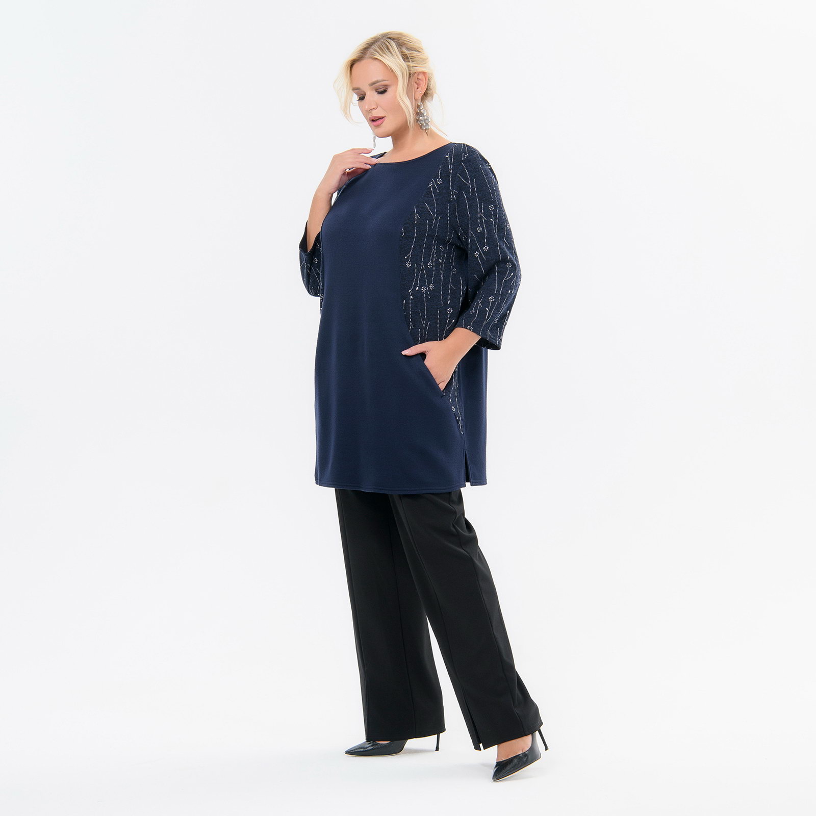Туника прямого силуэта с карманами, ангора темно-синяя, бочки с серебром