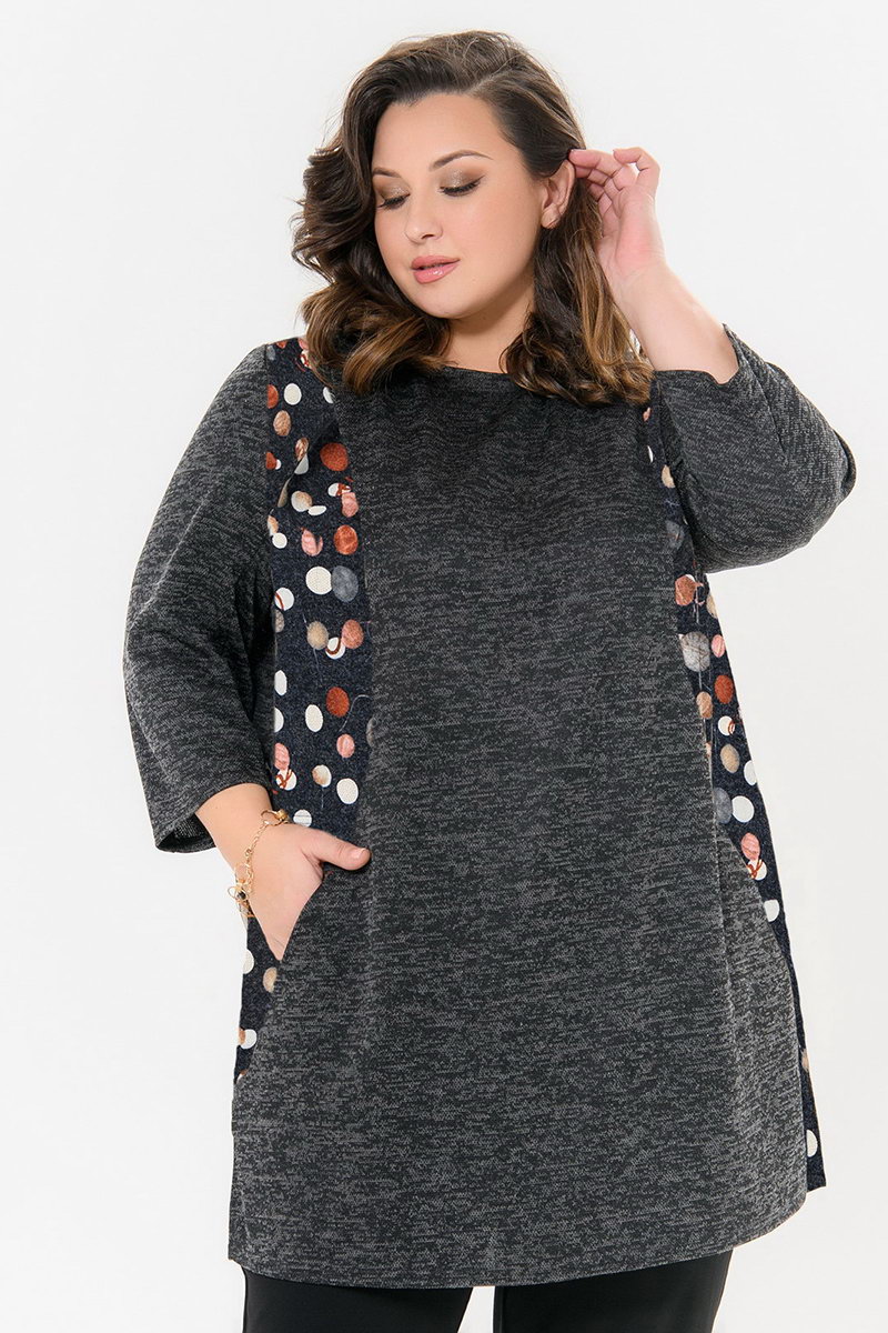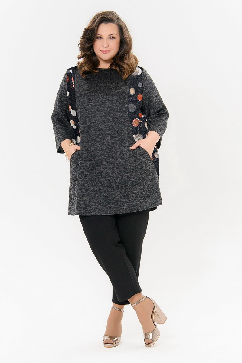 Туника прямого силуэта с карманами, меланж темно-серый, бочки принт