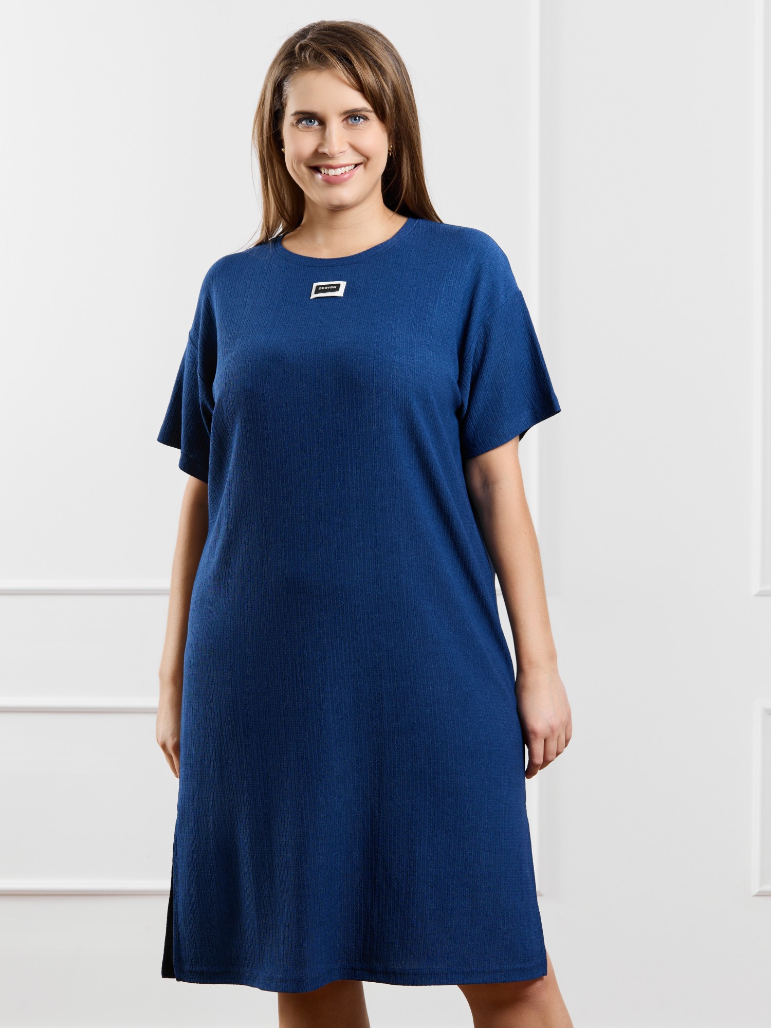 Туника женская из гладкокрашенного трикотажного полотна «бурумчук», прямого силуэта, с короткими втачными рукавами, горловиной овальной формы, обработанной втачной планкой, с разрезами в боковых швах. По центру полочки ниже горловины - настрочен декоративный элемент-нашивка.