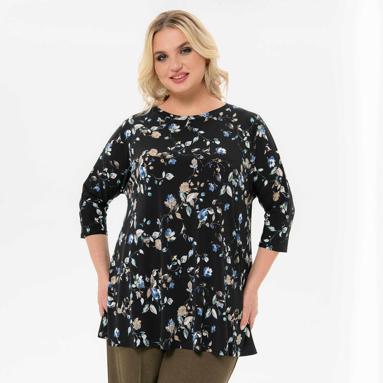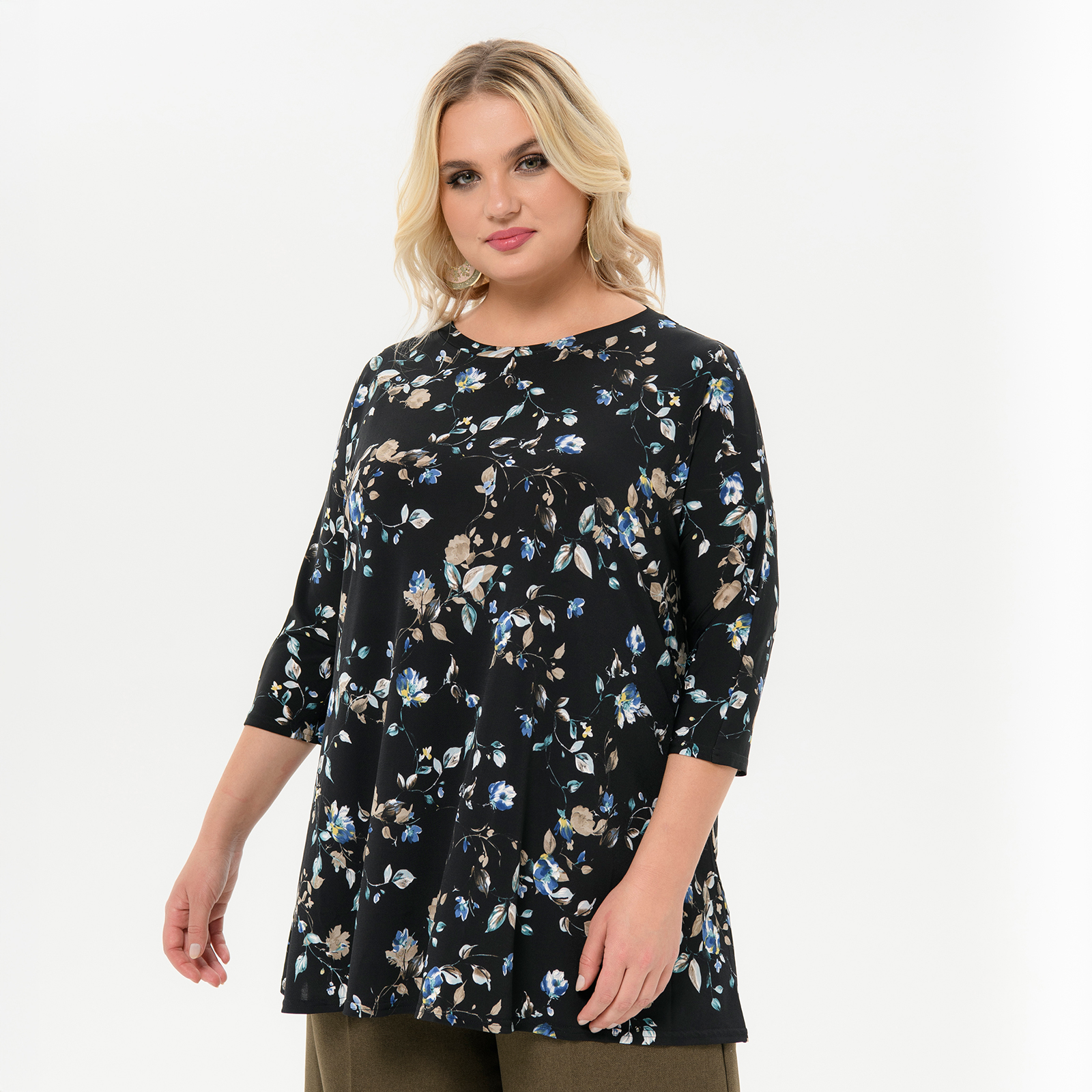 Туника с цельнокроеным рукавом черная с бирюзовыми цветами