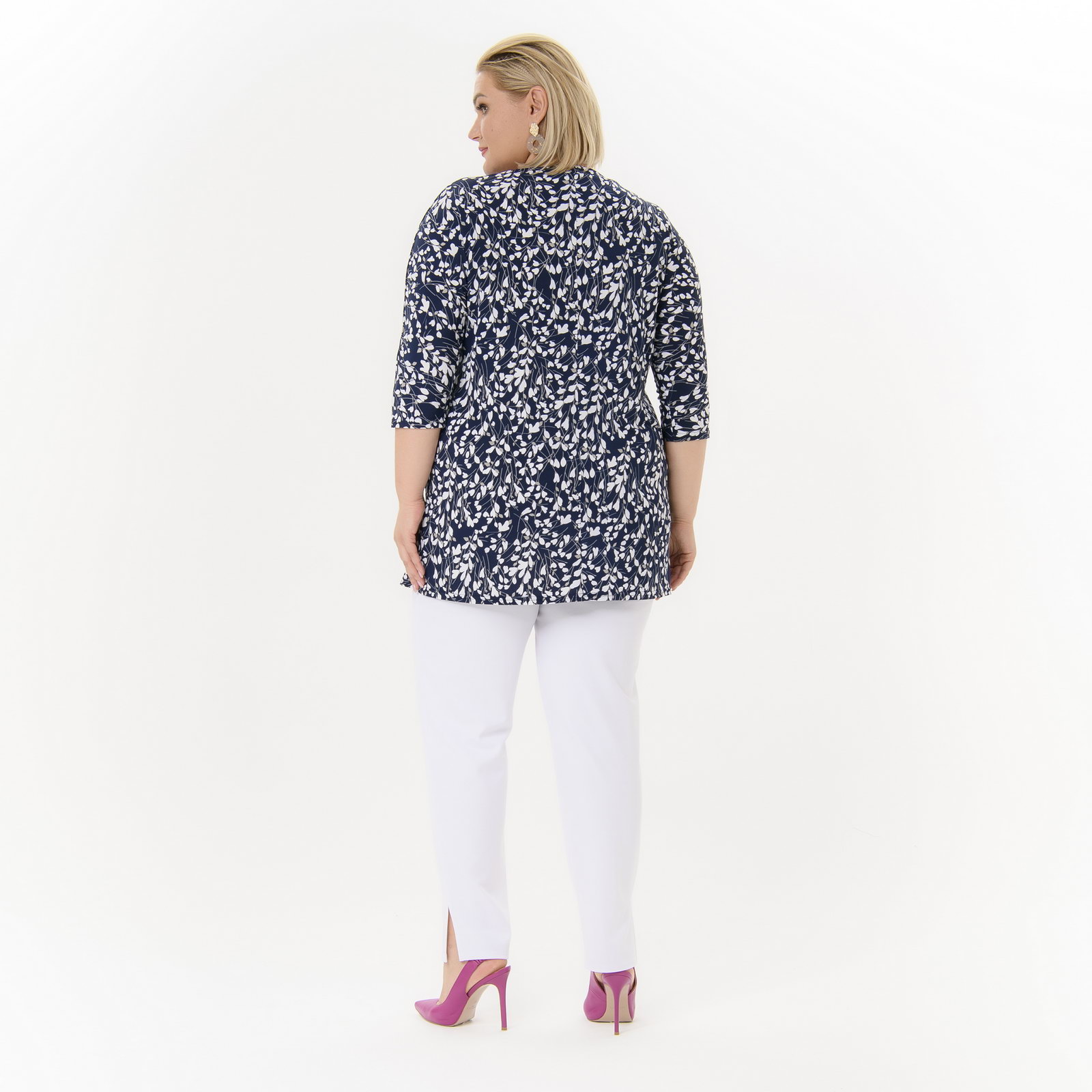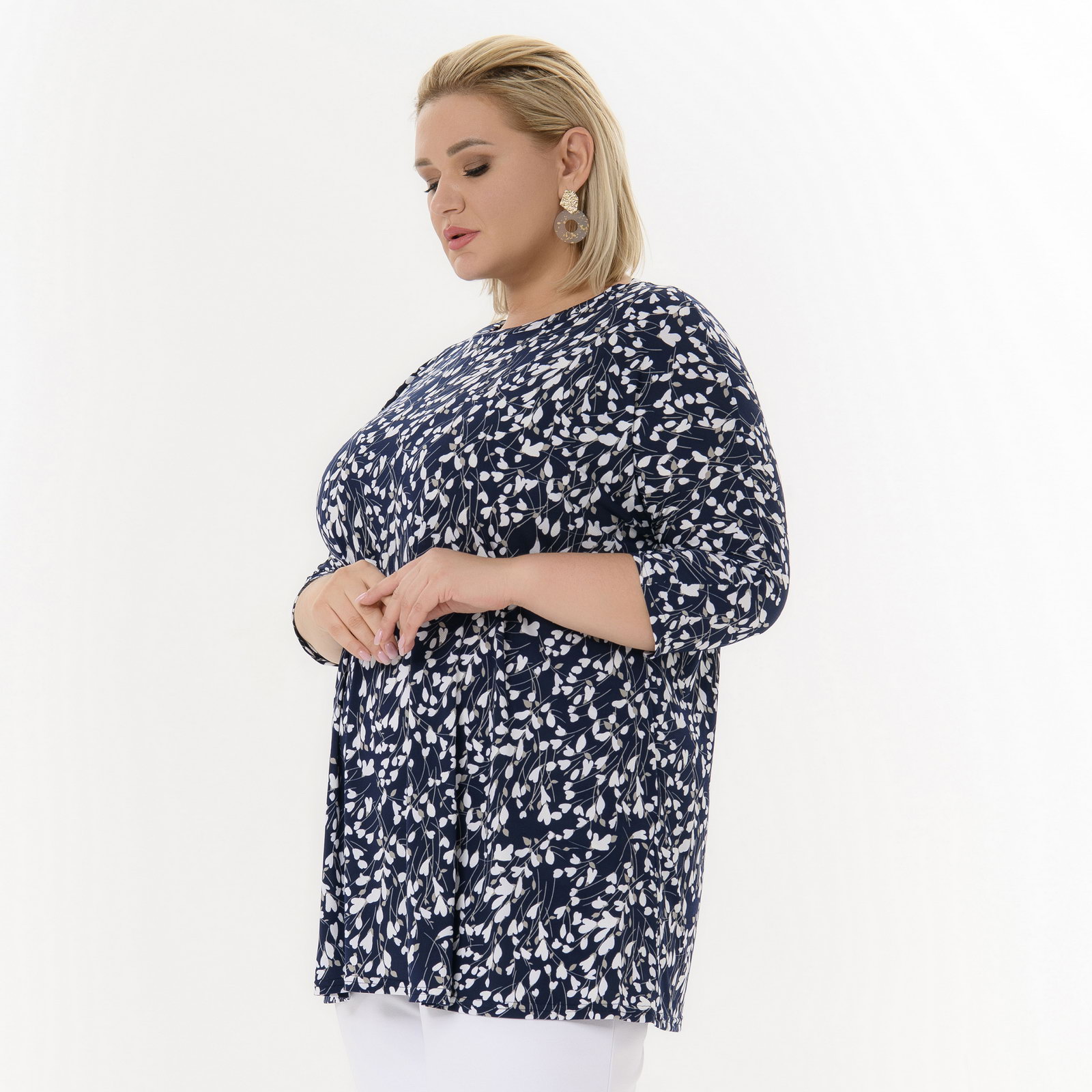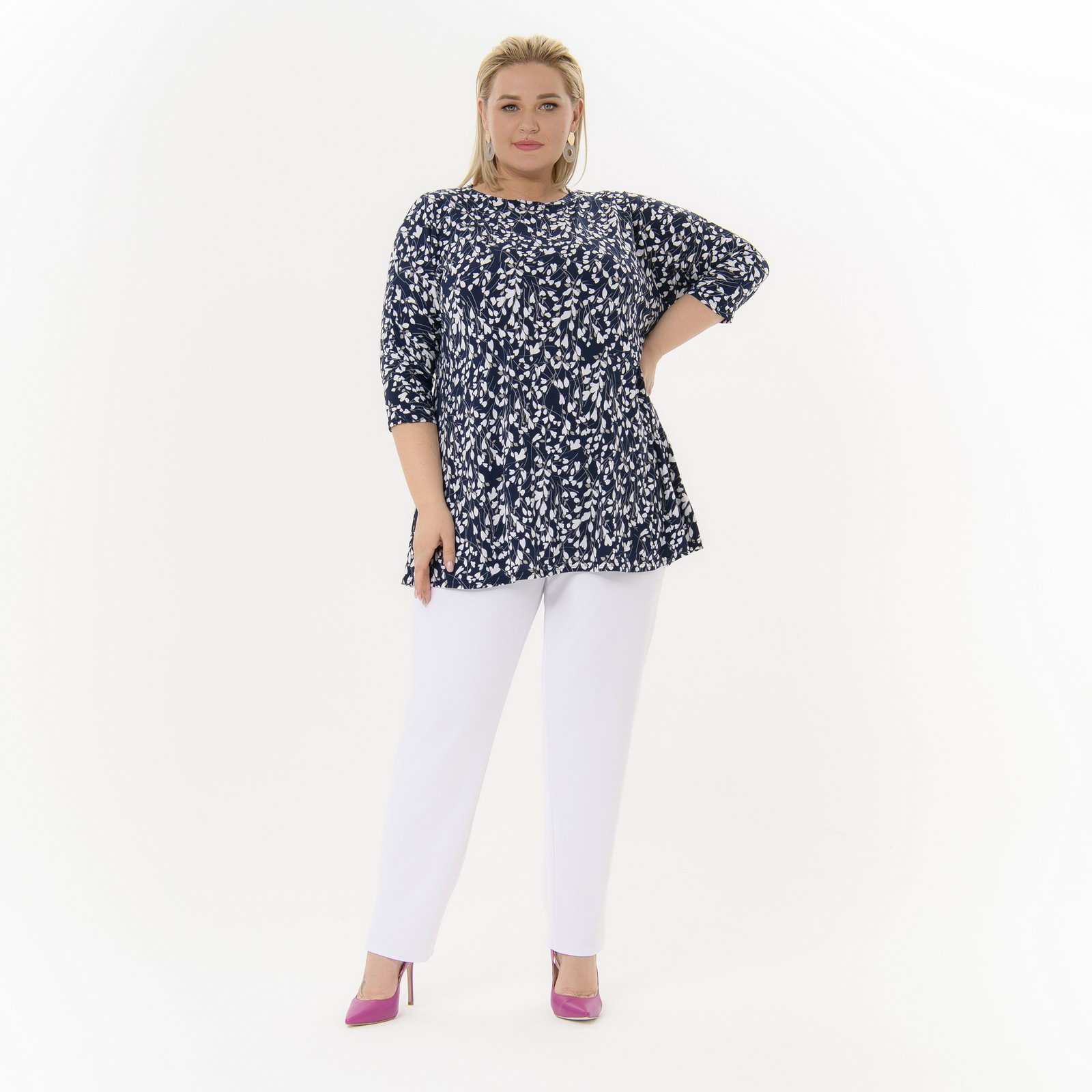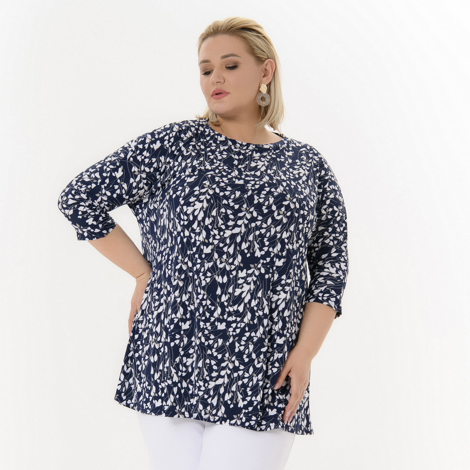 Туника с цельнокроеным рукавом, темно-синяя с белыми цветочками