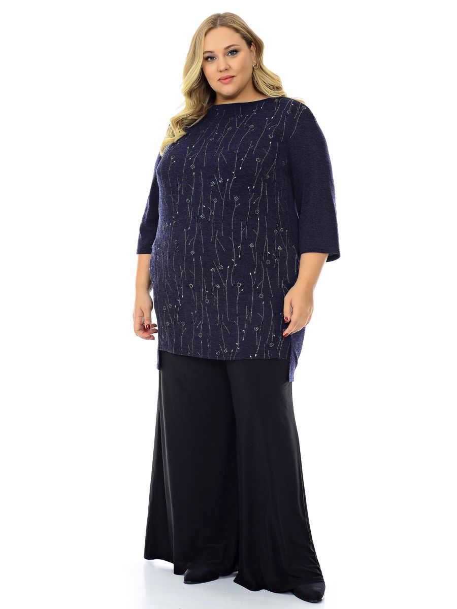 Туника прямого силуэта из джерси - ангора. Уникальность конструкции туники в отсутствии боковых швов. Спинка переходит в переднюю часть на уровне вертикальных рельефных швов, зрительно вытягивающих силуэт. В этих швах обработаны карманы и разрезы. Передняя часть короче задней на 6 см. Передняя часть туники с золотым напылением, спинка и рукава из ткани-компаньона. Удобный свободный рукав.
