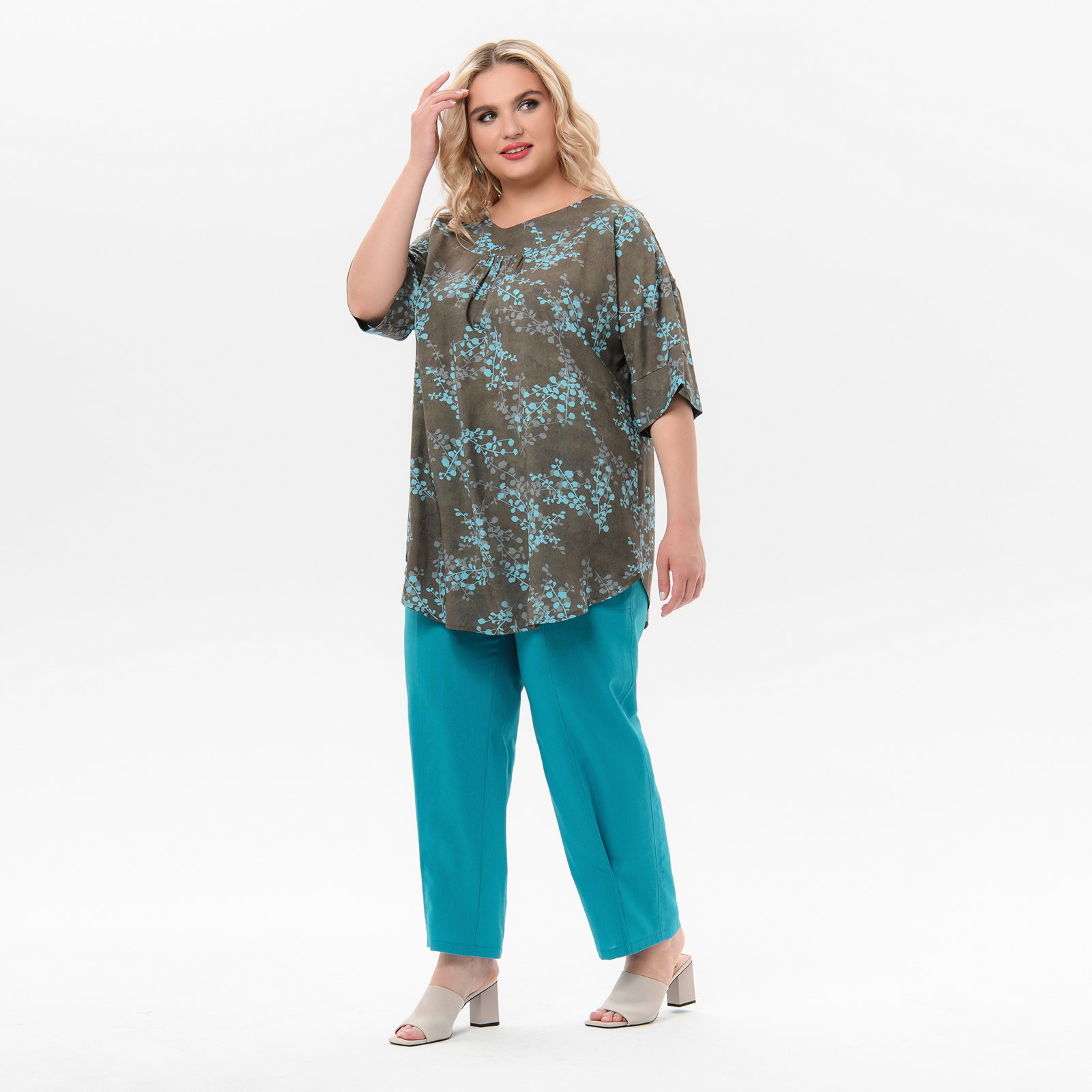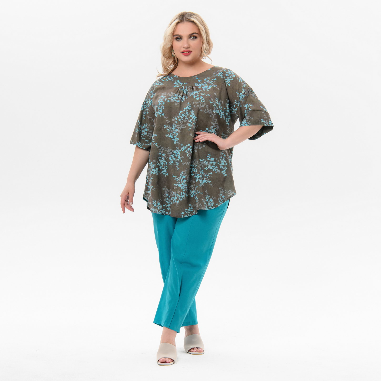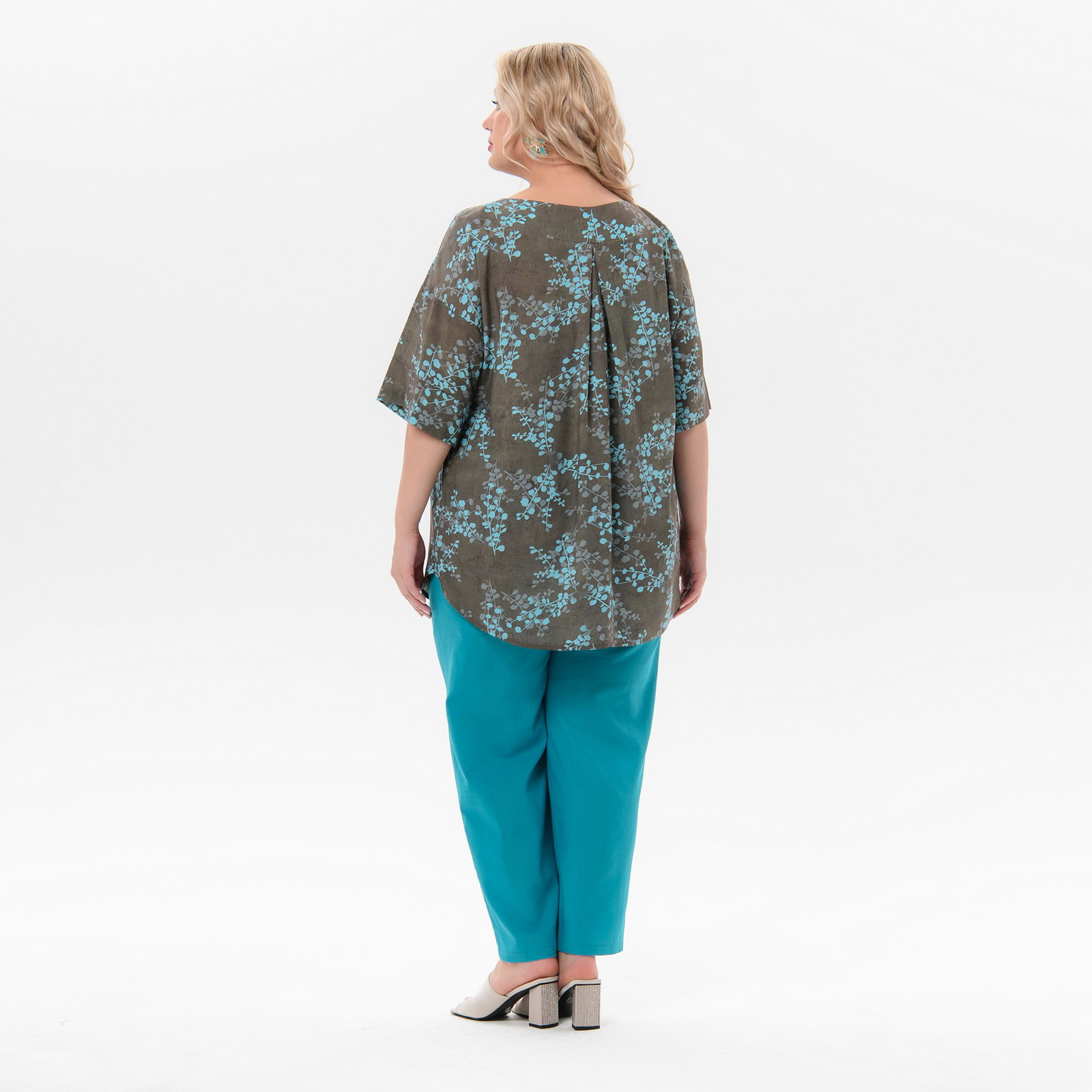 Туника с округлой обтачкой горловины, штапель, принт "хаки с бирюзой"