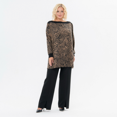Туника прямого силуэта из джерси с антипиллинговой обработкой. Уникальность конструкции в отсутствии боковых швов. Спинка переходит в переднюю часть на уровне вертикальных рельефных швов, зрительно вытягивающих силуэт. Также в этих швах обработаны карманы и разрезы. Передняя часть короче задней на 6 см. Удобный свободный рукав. Идеально сочетается с джинсами и зауженными брючками 077901.