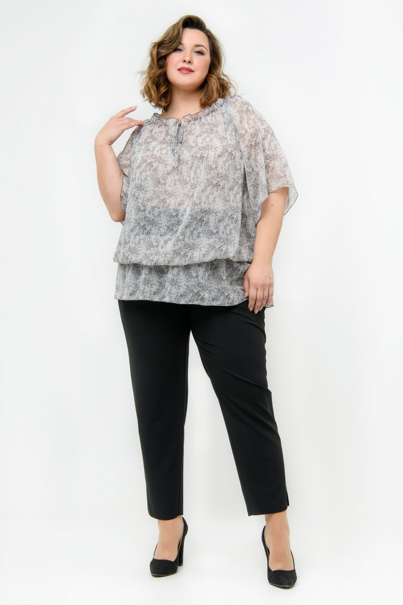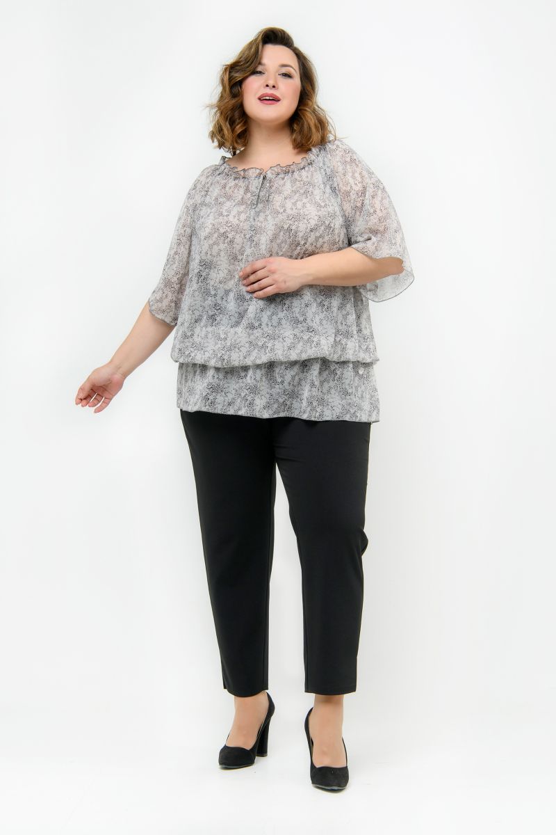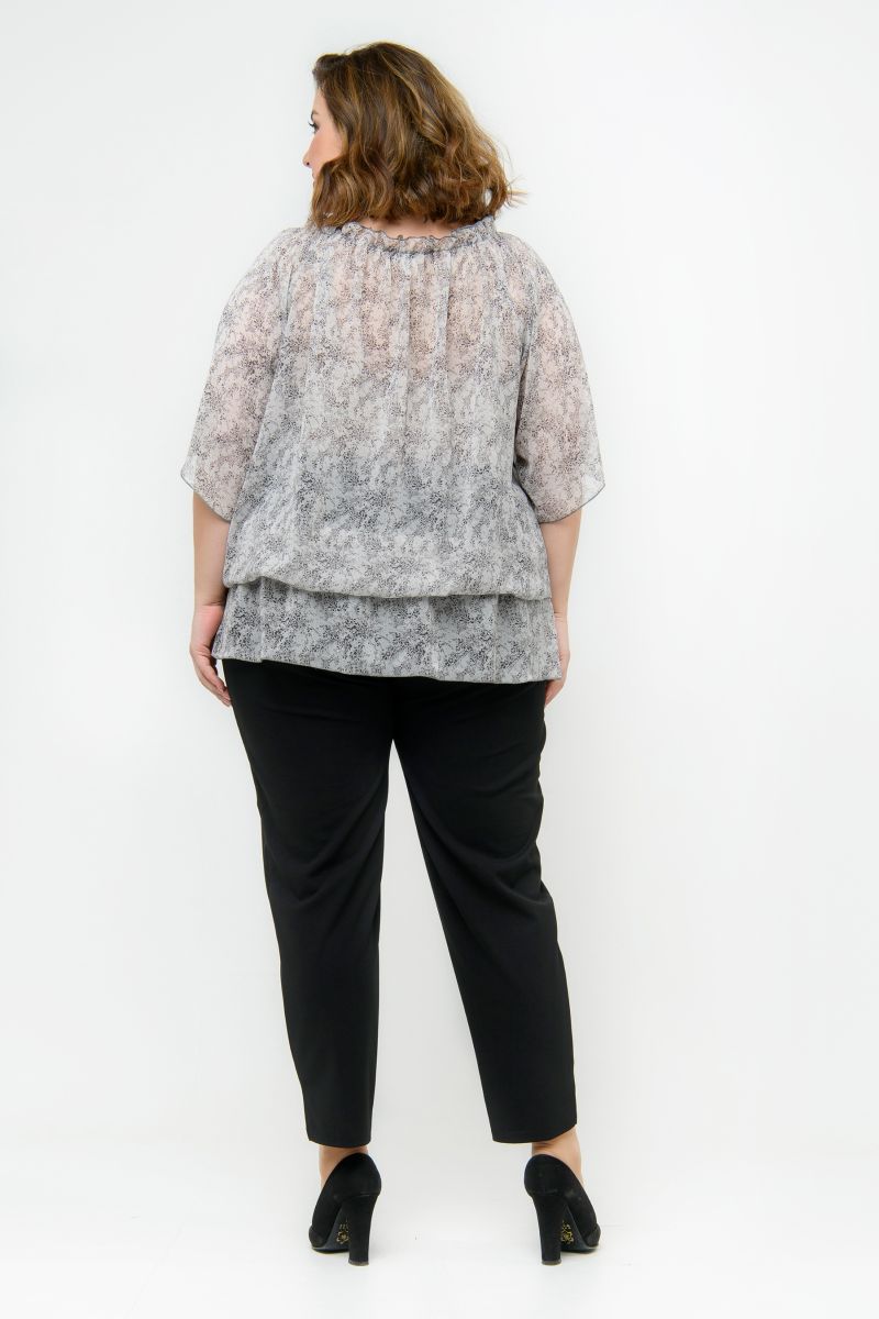Туника из шифона свободного силуэта. Рукав на основе реглан. Линия горловины расширена, на резинке, за счет чего можно приоткрыть плечи. На уровне линии талии напуск, зафиксированный резинкой.