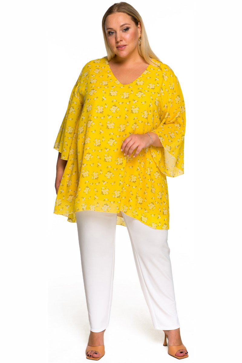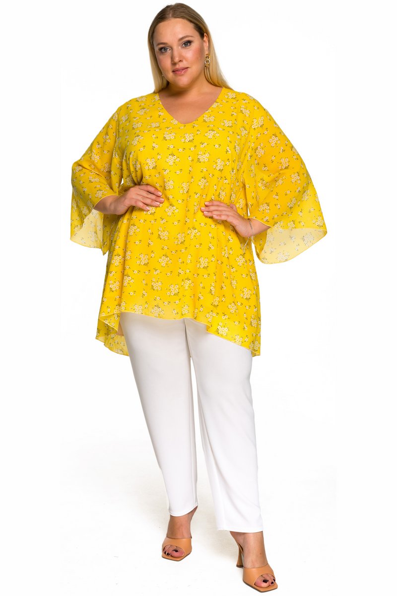 Свободная туника с асимметричной линией низа  из шифона. V-вырез горловины. Рукав расклешенный. Идеально сочетается с джинсами, зауженными брючками.