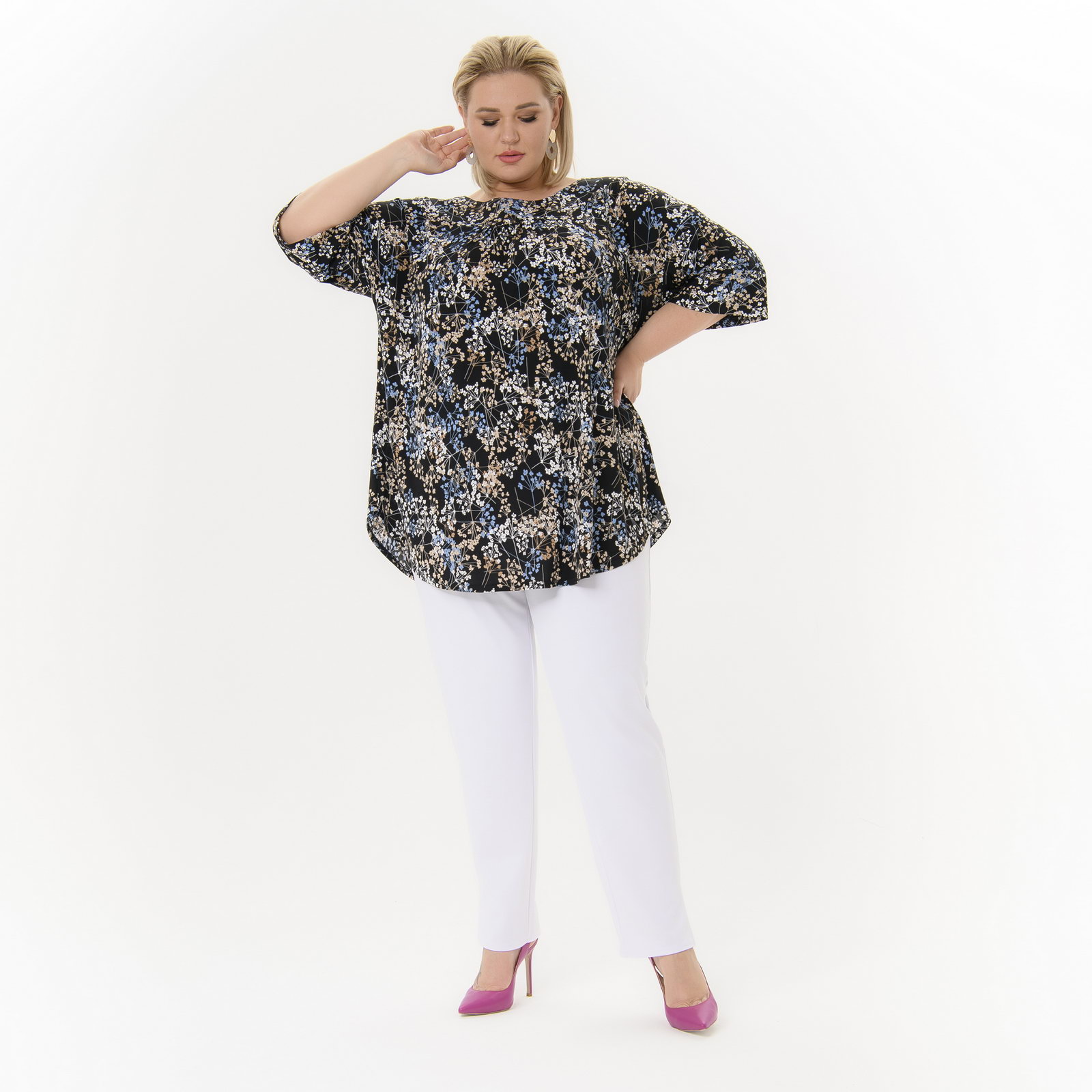 Свободная туника из трикотажа "масло".  Горловина на широкой закругленной обтачке. По центру переда из под кокетки сборочка, по центру спинки встречная складка. Линия плеча спущена, рукав прямой, расширенный.