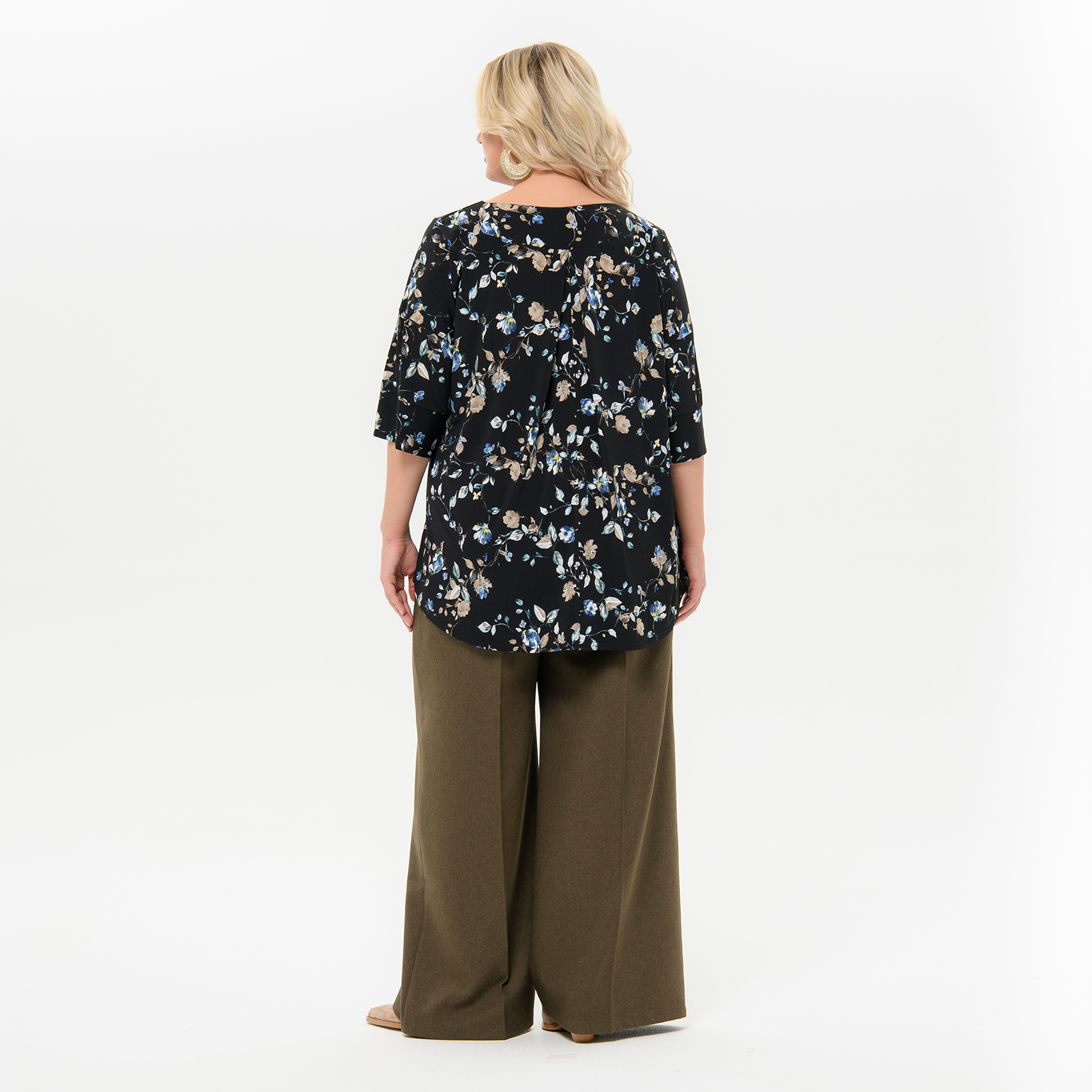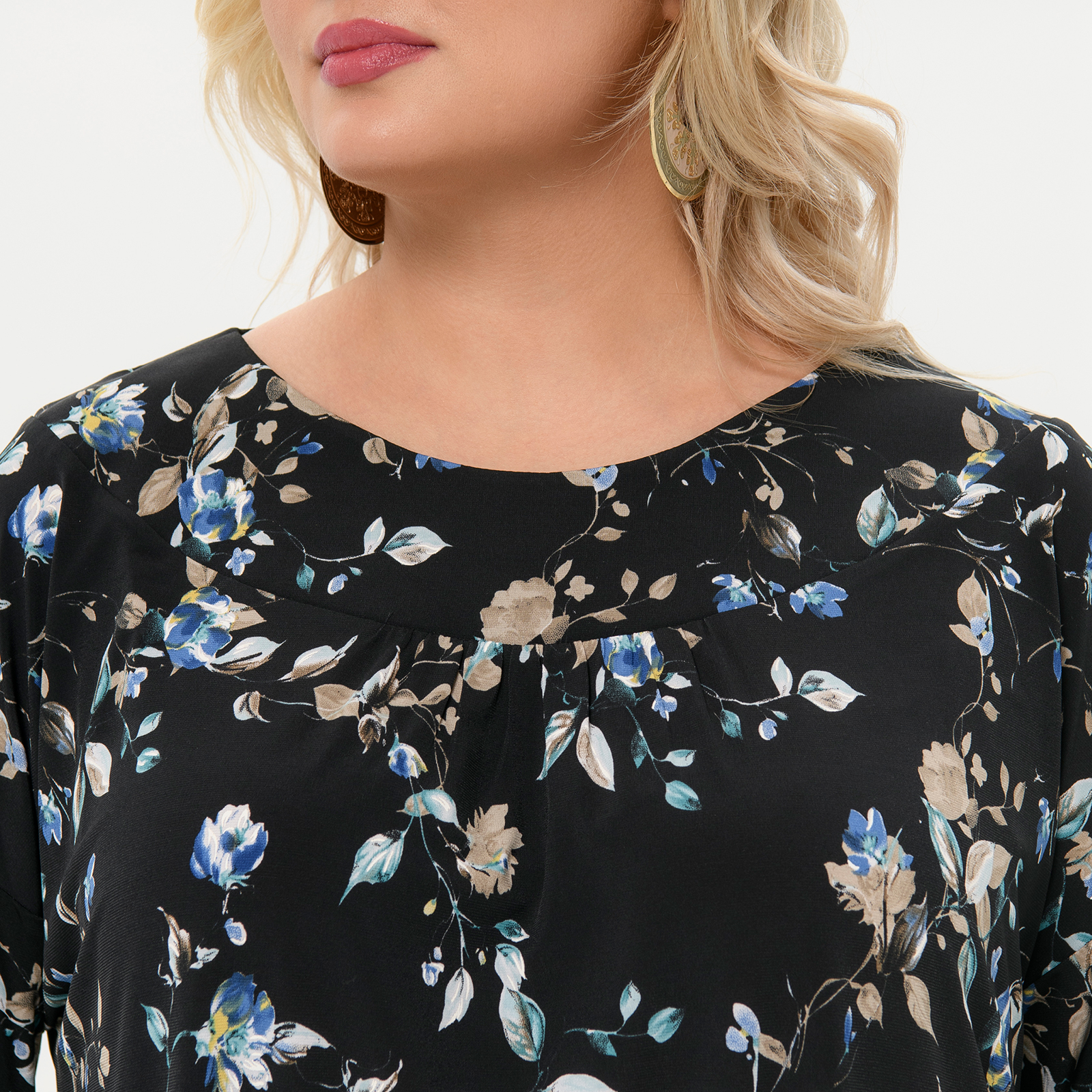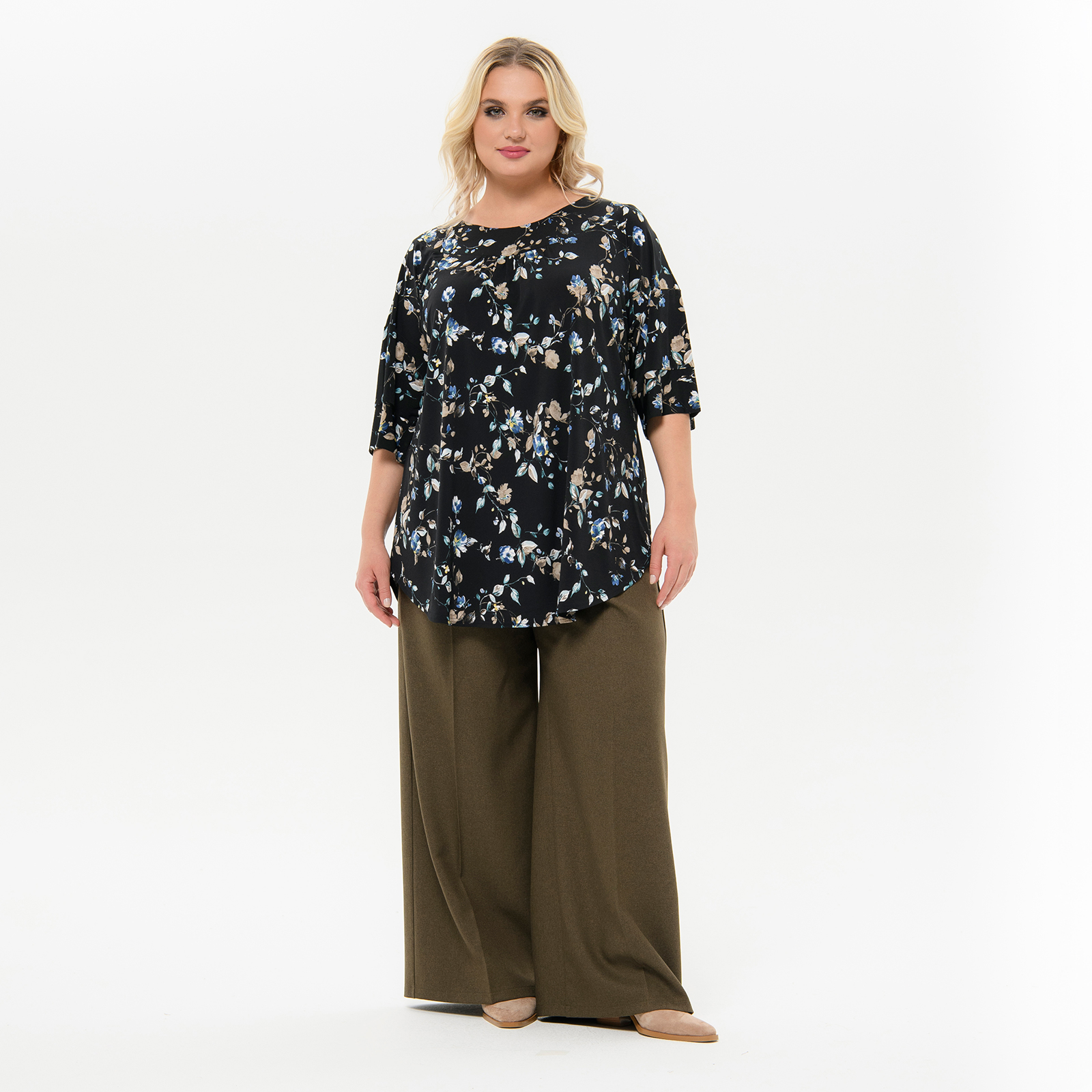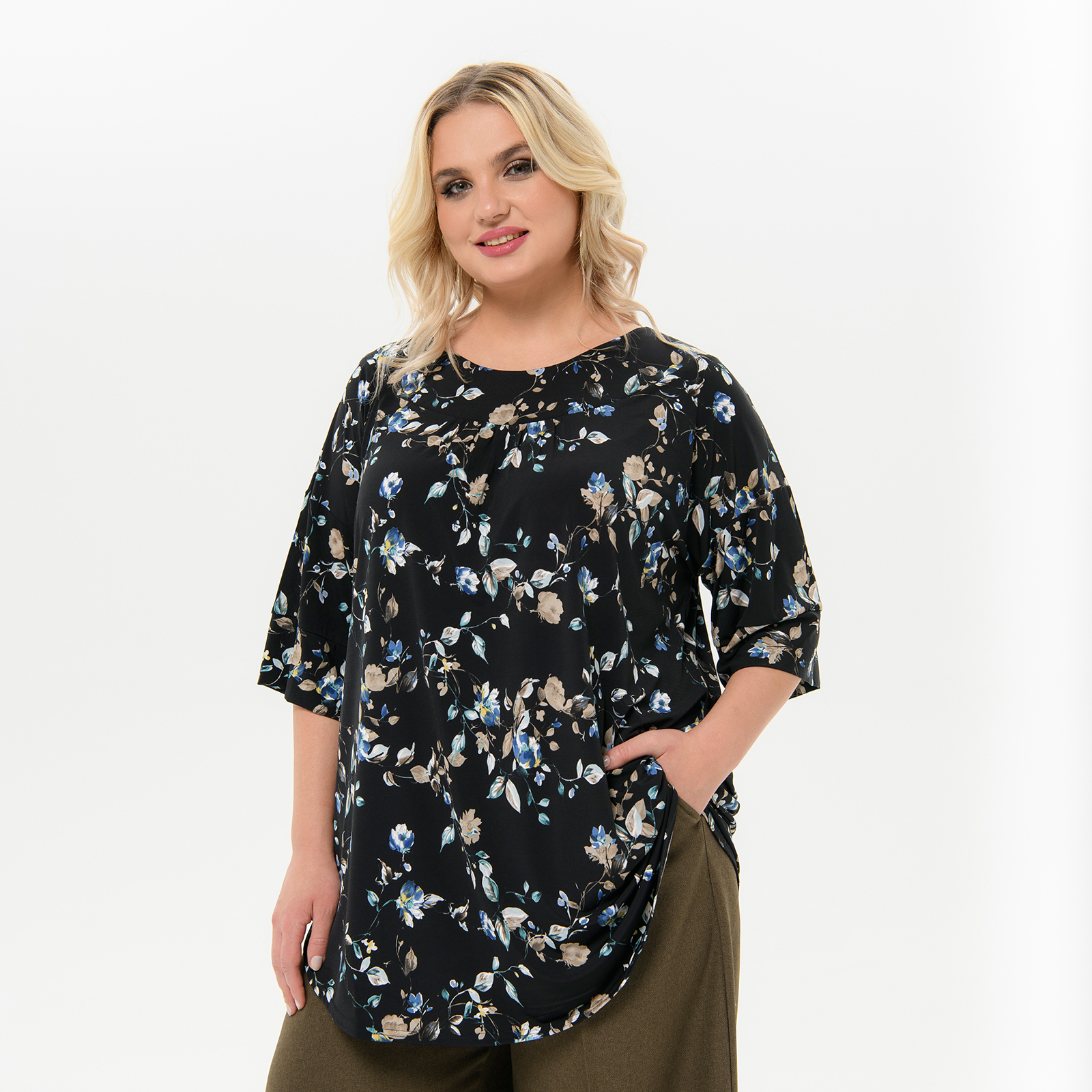 Туника свободная, черная с бирюзовыми цветами