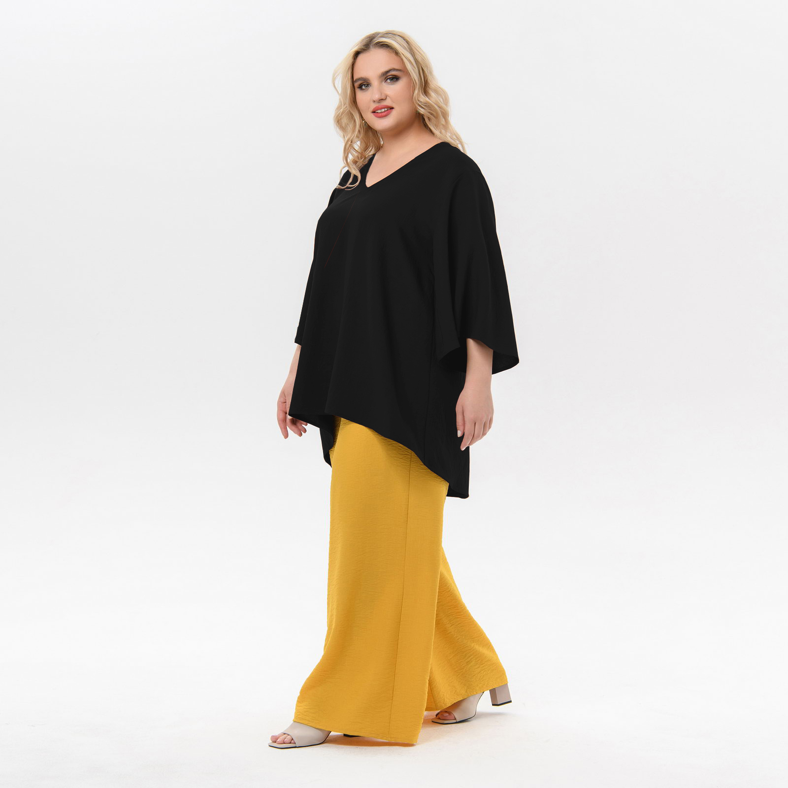 Туника свободного силуэта с асимметричной линией низа из плательной ткани средней плотности. V-вырез горловины. Рукав расклешенный, линия плеча спущена. Идеально сочетается с зауженными и широкими брючками.