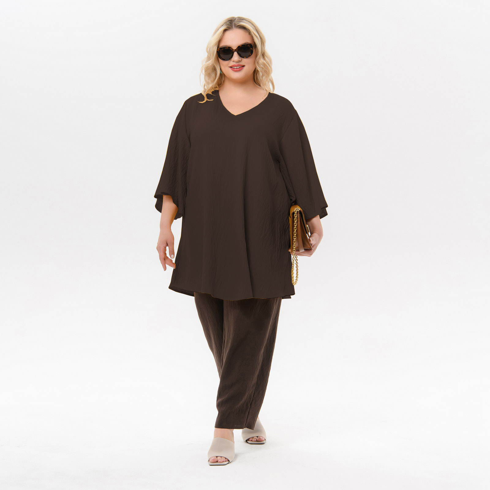 Туника  свободного силуэта из плательной ткани средней плотности. V-вырез горловины. Рукав расклешенный, линия плеча спущена.