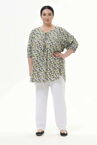 Свободная туника из принтованного штапеля с цельнокроенным рукавом. Верхняя часть на кокетке. Нижняя часть со сборкой по шву притачивания кокетки. Вырез горловины фигурный, завязывающийся на шнурочек из основной ткани.