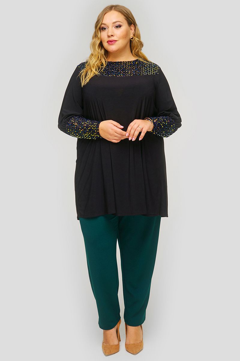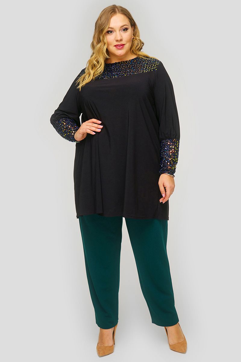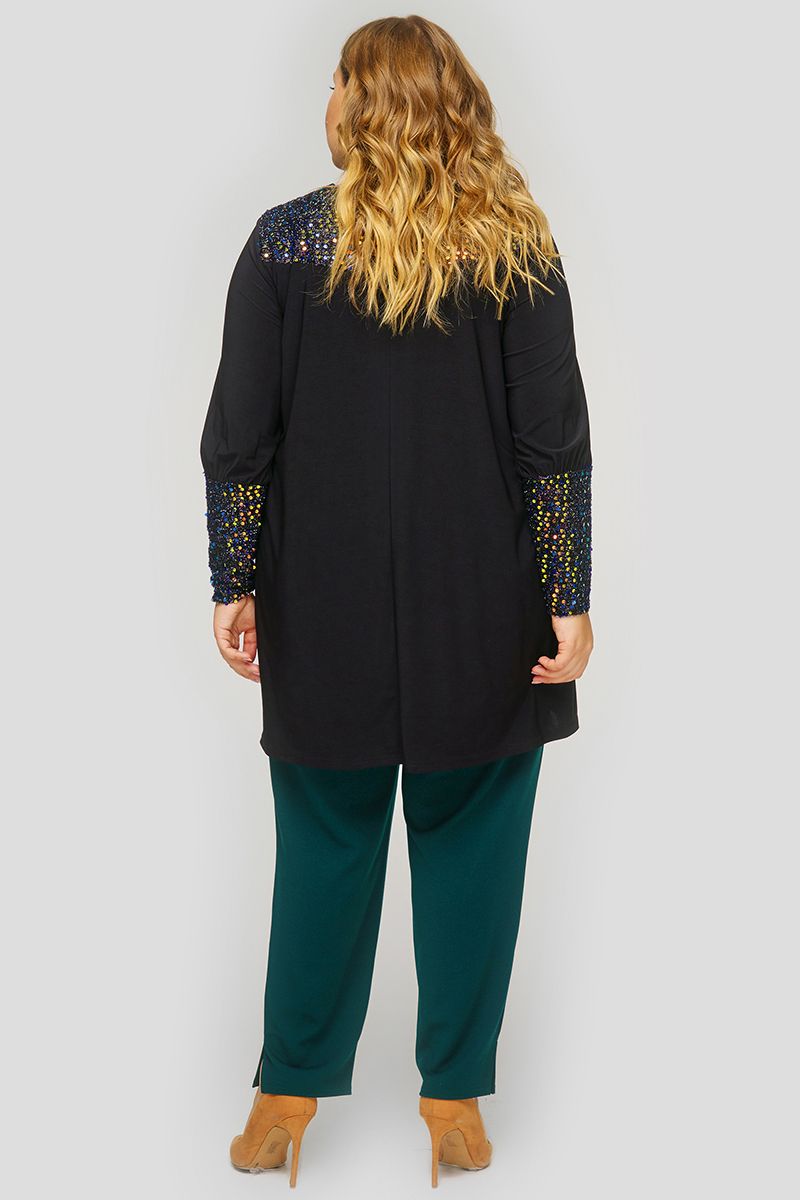 Туника свободная, кокетка и манжеты из пайеток, черная