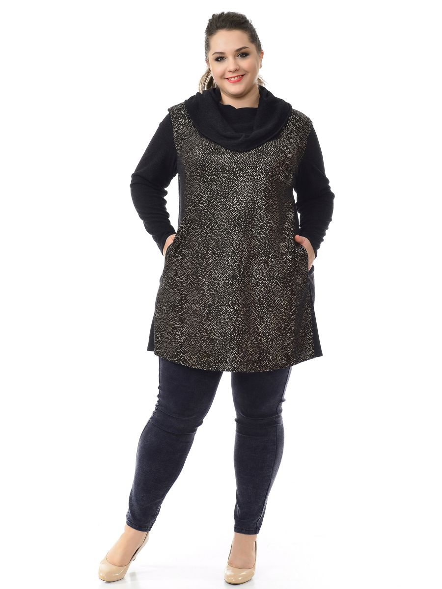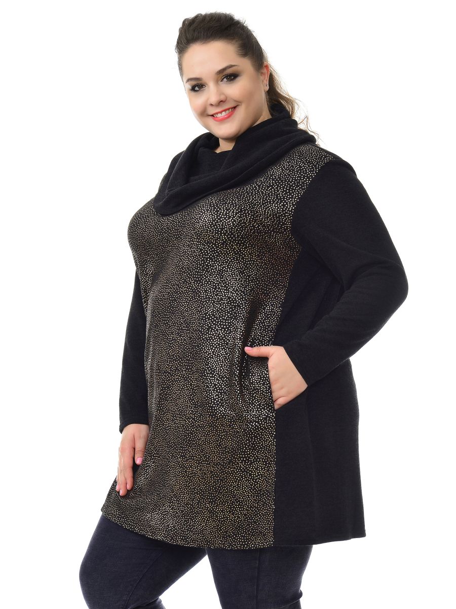 Туника свободного силуэта из искусственной ангоры. Уникальность ее конструкции в отсутствии боковых швов. Спинка переходит в переднюю часть на уровне вертикальных рельефных швов, зрительно вытягивающих силуэт, в этих швах обработаны карманы. Передняя часть туники из ткани с золотым напылением. По горловине воротник - "хомут". Идеально сочетается как с брюками, так и с юбкой.