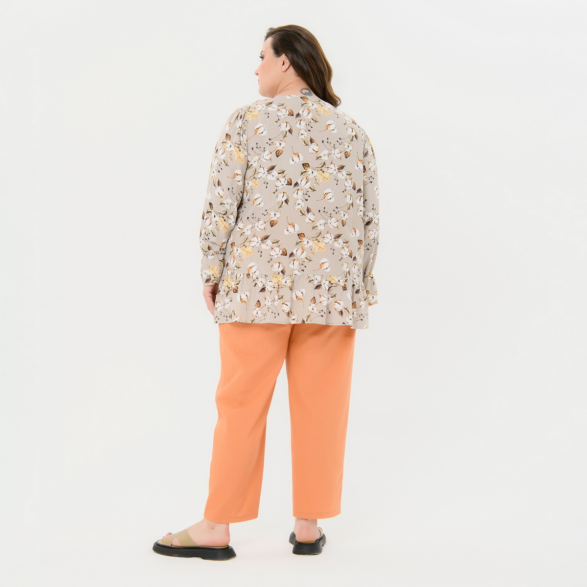 Свободная туника из штапеля. Вырез горловины округлый, по центру переда фиксируется завязочками из основной ткани. Рукав широкий, со сборочкой по окату, позволяет скрыть любую полноту рук. Рукав заканчивается оборочкой из основной ткани. В шов притачивания оборки  к рукаву вставлена резиночка, с ее помощью можно регулировать длину рукава.