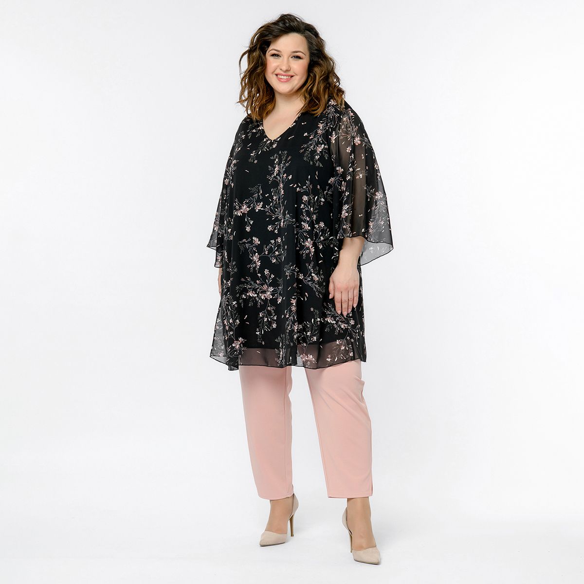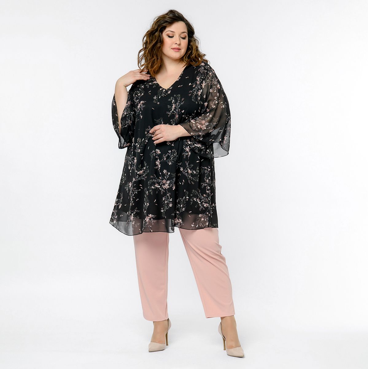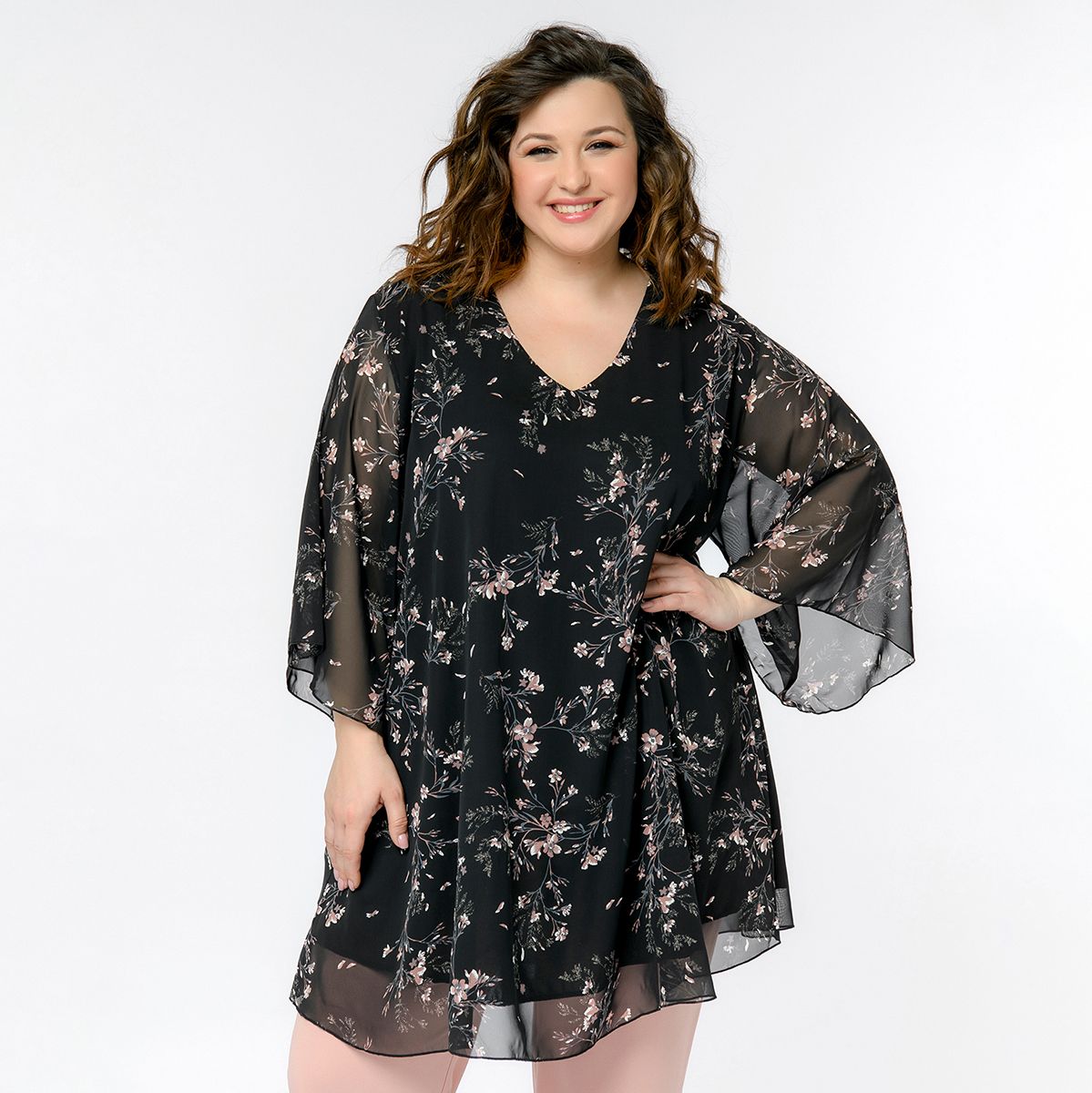 Свободная туника  из шифона. V-вырез горловины. Рукав расклешенный. Идеально сочетается с джинсами, зауженными брючками.