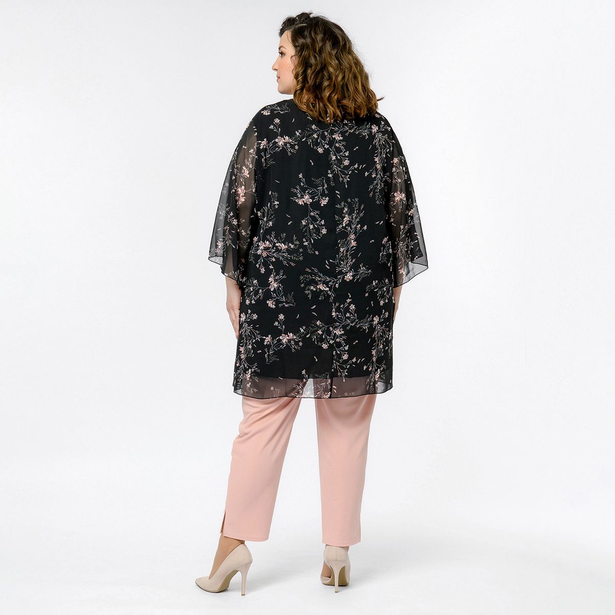 Туника свободная, шифон черный, принт "пудровые цветы"