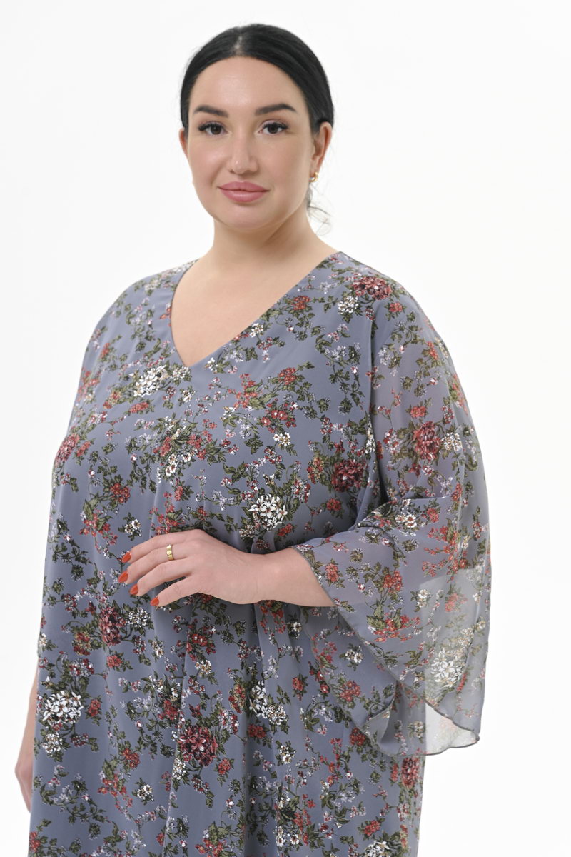 Туника свободная, шифон, принт цветочный, фон графитовый